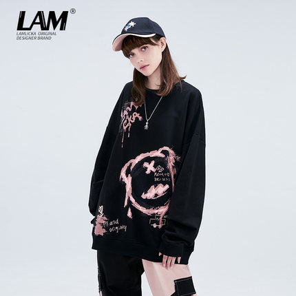 LAMLICKA卡通熊猫印花男圆领长袖卫衣日系情侣休闲宽松套头上衣女