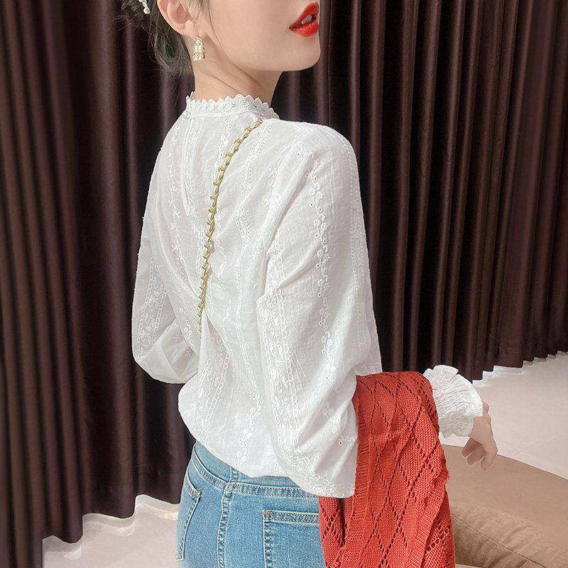 白色雪纺上衣小立领蕾丝打底衫女2026春季长袖洋派内搭灯笼0102e