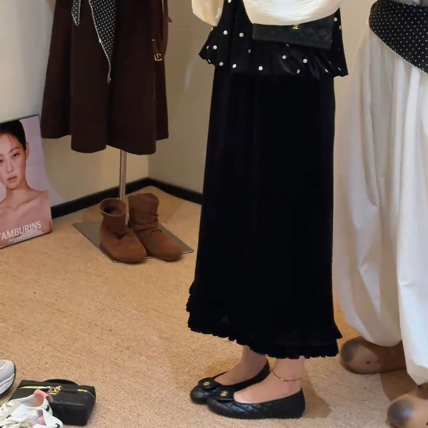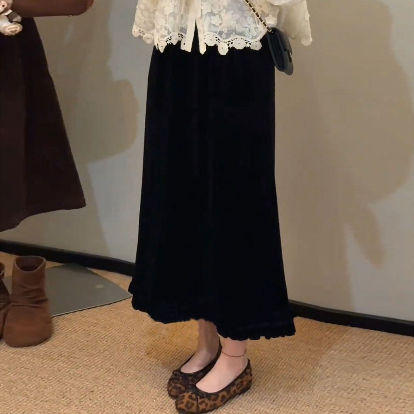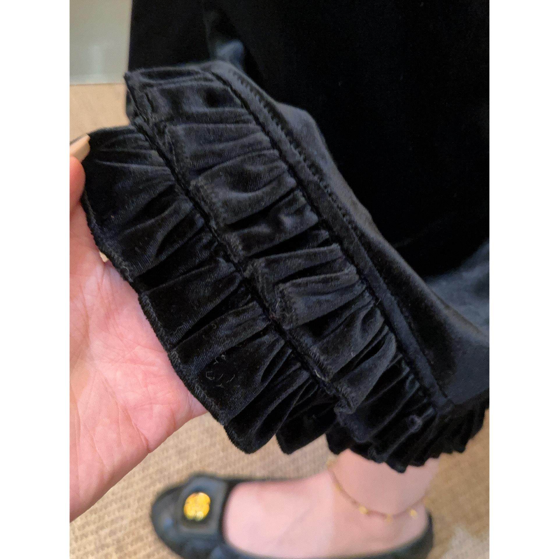 金丝绒开叉木耳边半身裙2025松紧百搭秋冬花边高腰显瘦荷叶边长裙