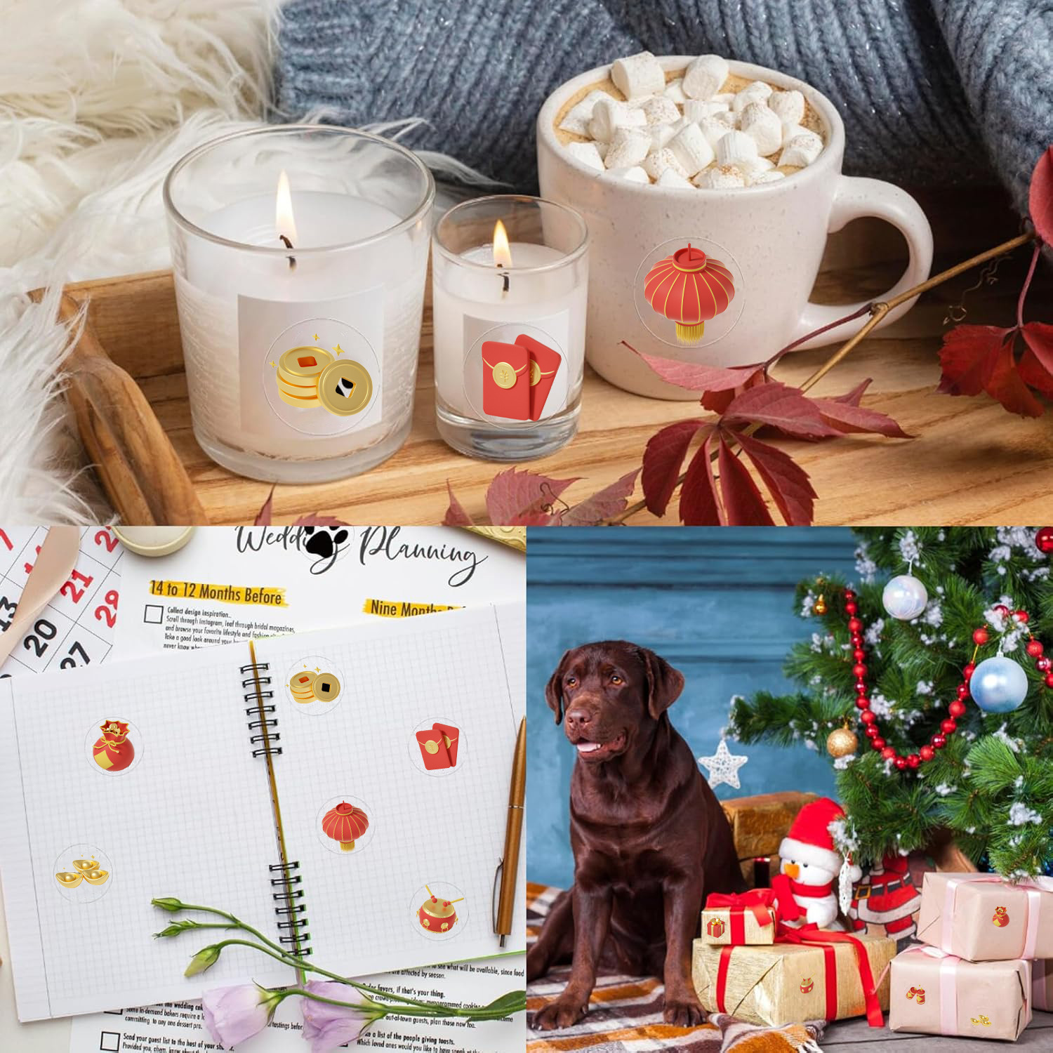 塑料透明新年礼物喜庆小贴纸国风红灯笼元宝福字贴红包福袋封口贴结婚喜糖包装自粘贴乔迁祝福装饰手机贴防水