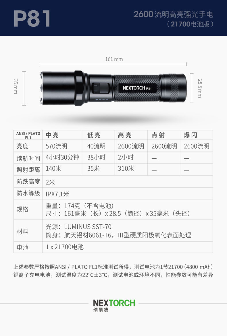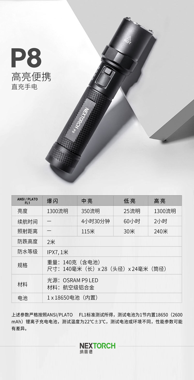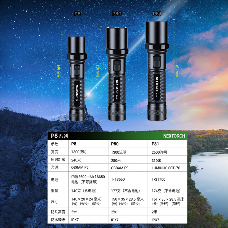 纳丽德P8/P80/P81强光手电筒多功能超亮远射充电防水战术防身手电