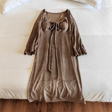 春秋冬季新款海岛绒带胸垫睡裙女长袖网红风中长款性感睡衣家居服