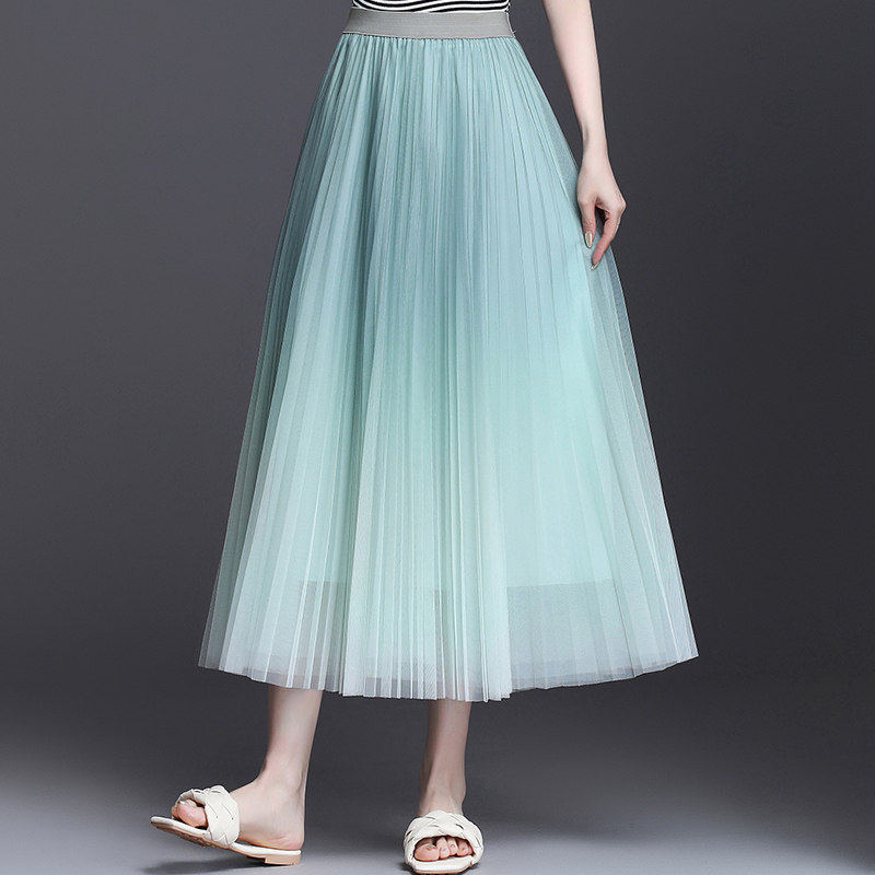 渐变色纱裙女春季2026新款中长垂坠感网纱半身裙显瘦a字百褶裙子