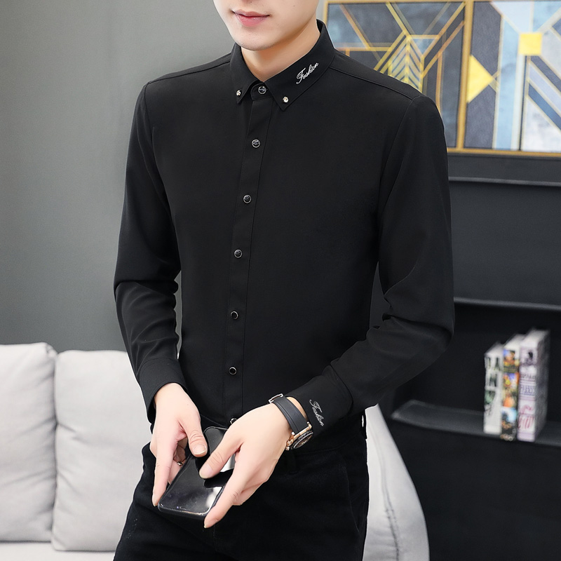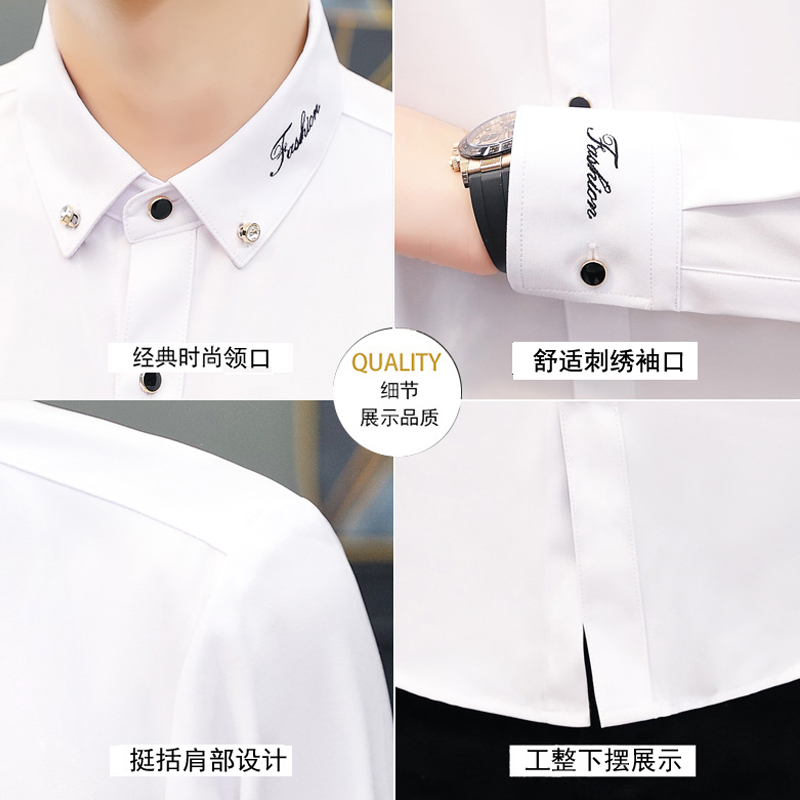 秋季弹力休闲白衬衫男士长袖韩版修身衬衣男式商务免烫刺绣寸衫潮