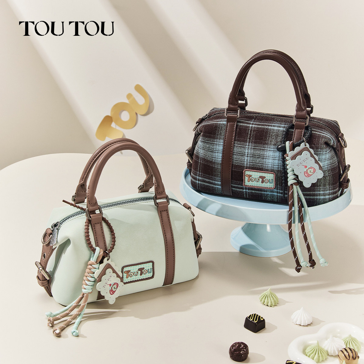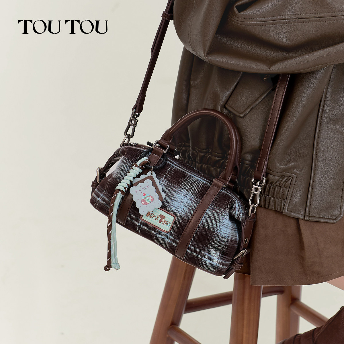 TOUTOU透透格纹波士顿包斜挎包