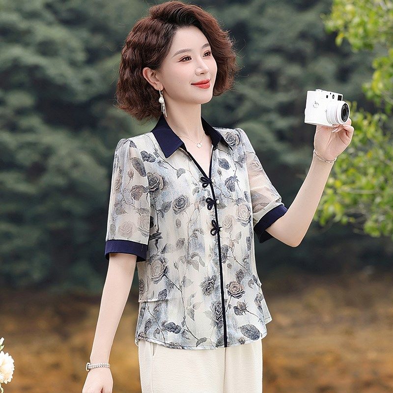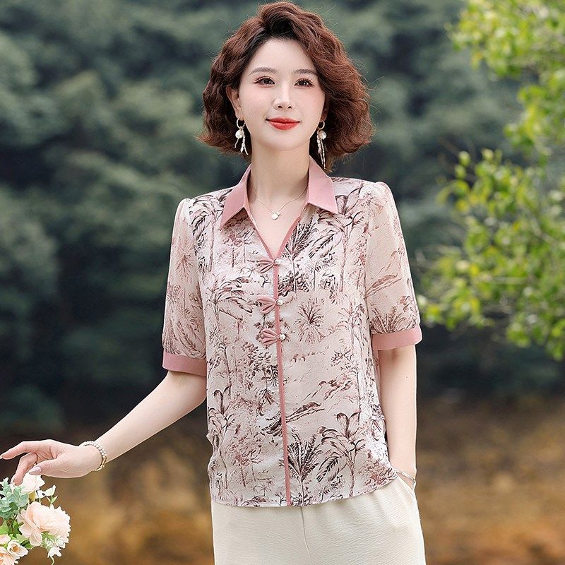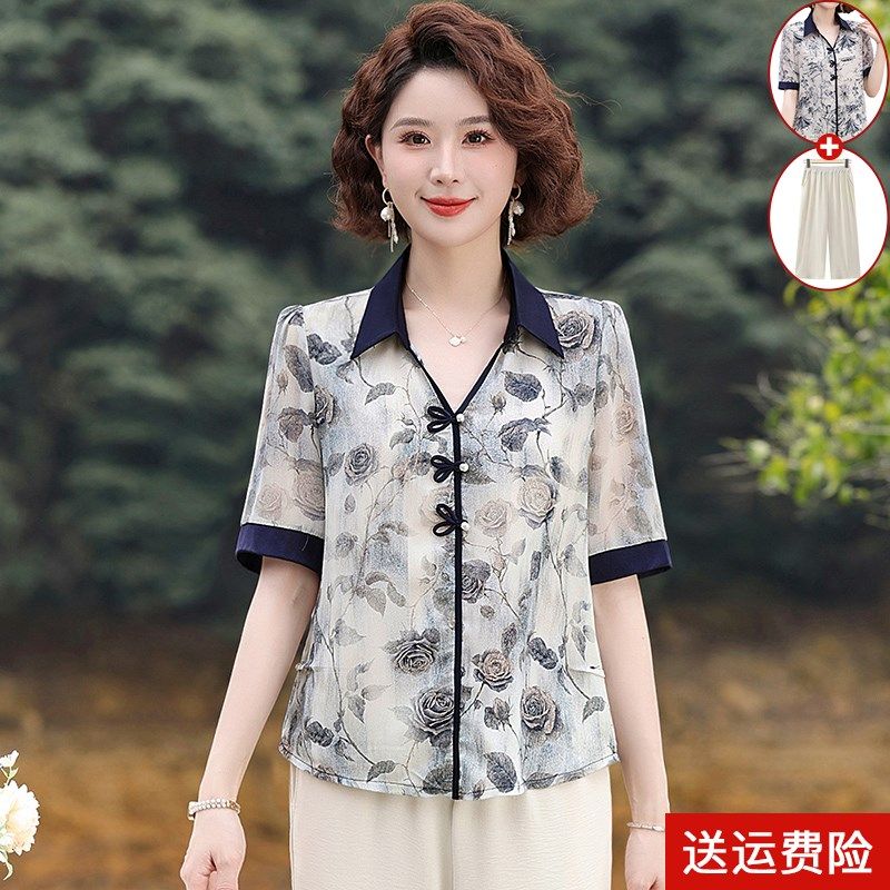 2025新款中年妈妈夏装套装雪纺小衫上衣中老年女装短袖衬衫两件套
