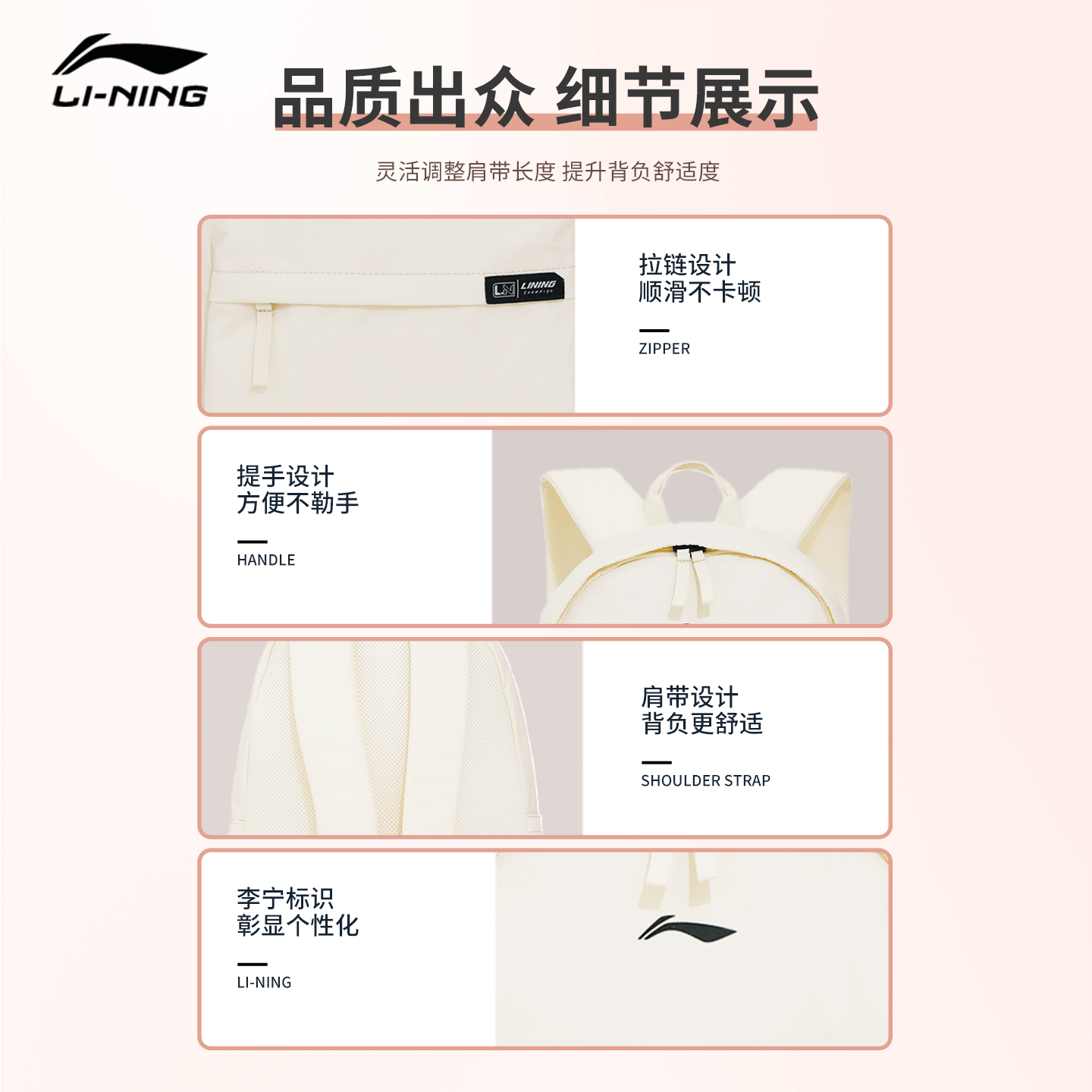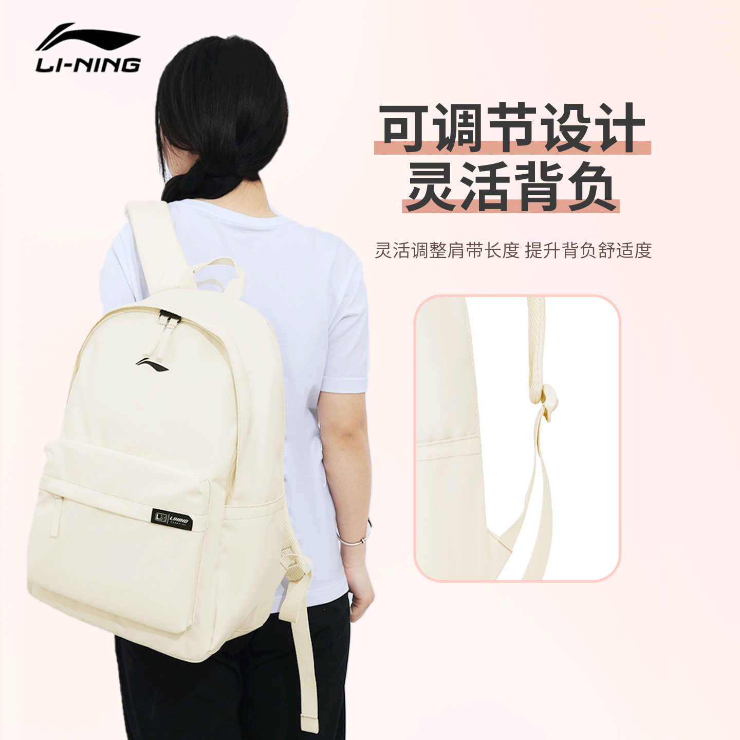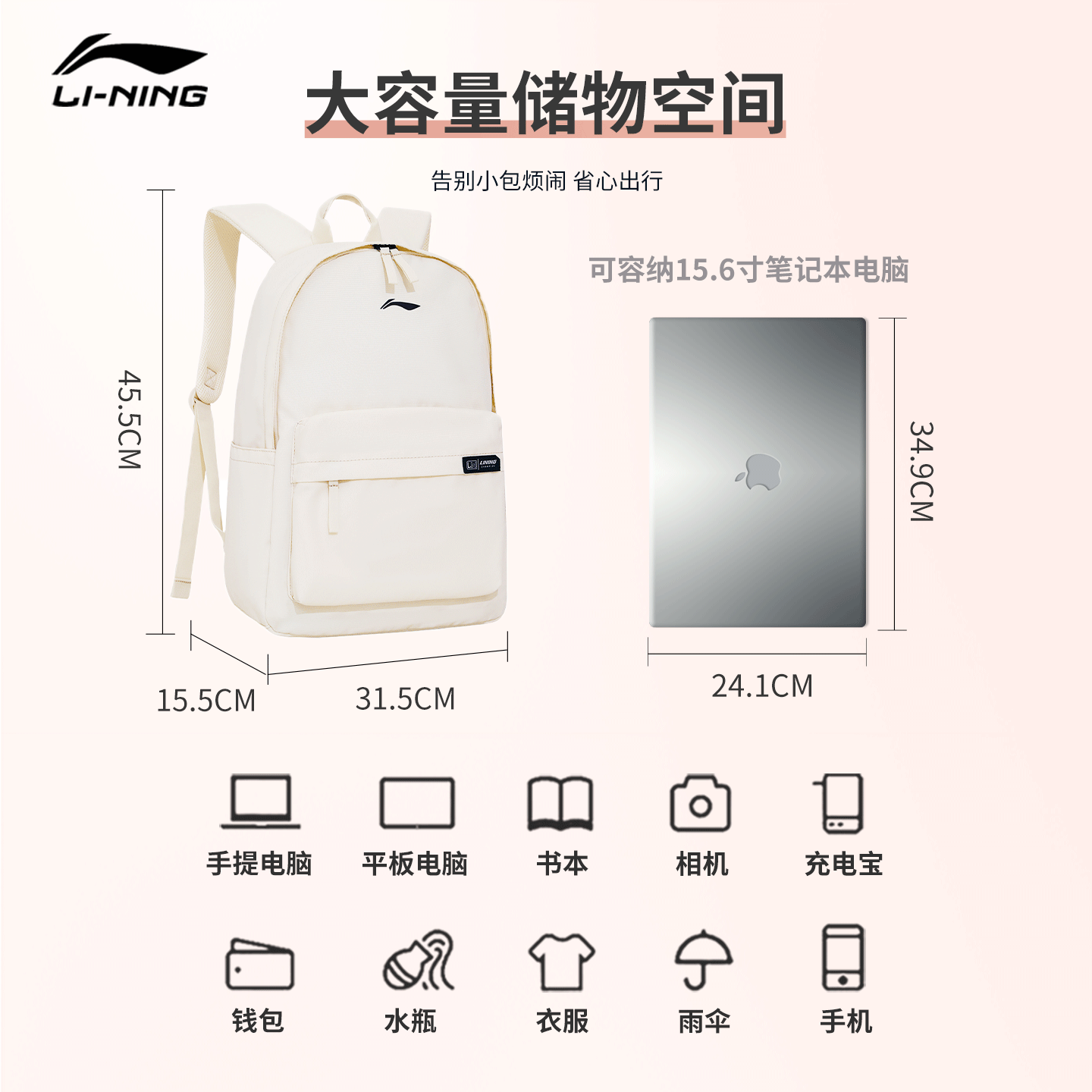 李宁米白色大容量双肩背包