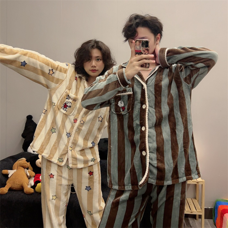 史努比条纹情侣睡衣冬男女珊瑚绒