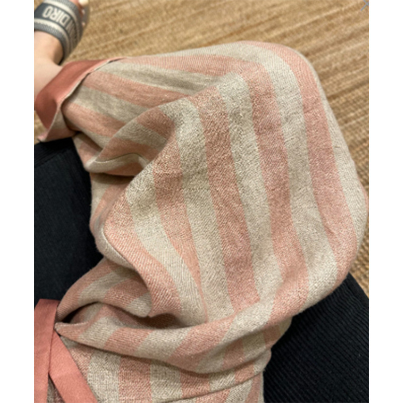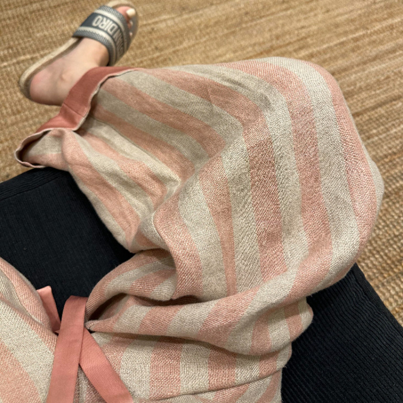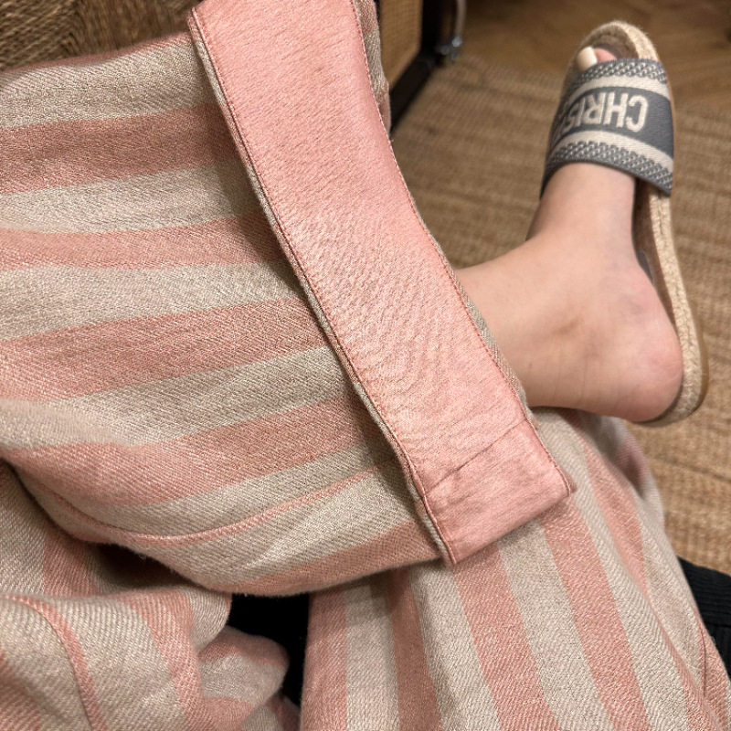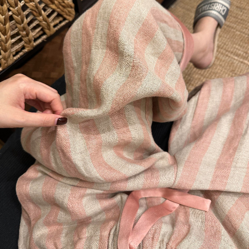 日系高级感条纹拼色亚麻睡裤女2025夏季大码宽松家居阔腿裤外穿