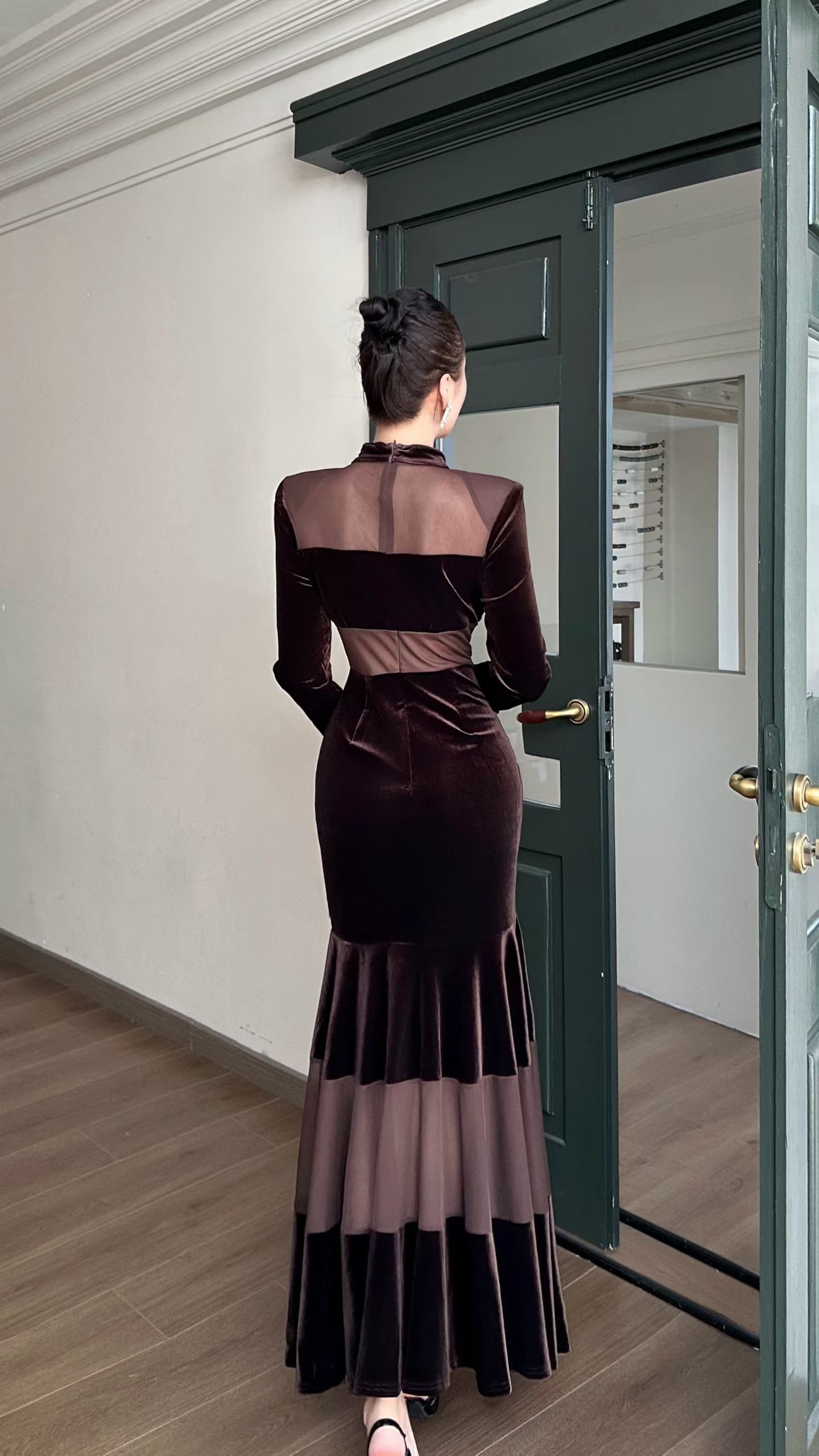 2025秋冬新款气质名媛风设计感网纱拼接丝绒收腰显瘦连衣裙套装女
