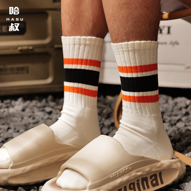 哈叔/HASU 秋冬季加厚保暖毛巾底长袜男士潮牌条纹中筒袜高筒潮袜