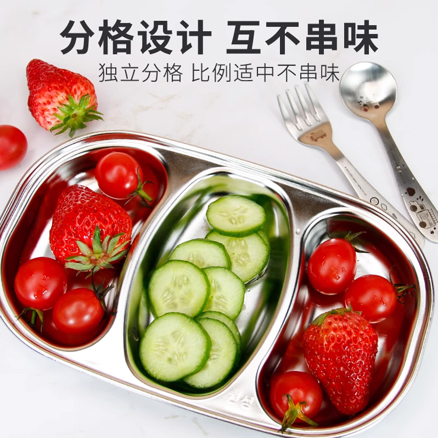 联扣韩国进口儿童不锈钢分格餐盘三格长方形幼儿园小水果盘辅食盘