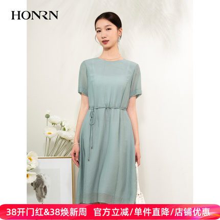 HONRN/红人绿色纯色桑蚕丝真丝系带收腰短袖连衣裙女夏HI22OL619