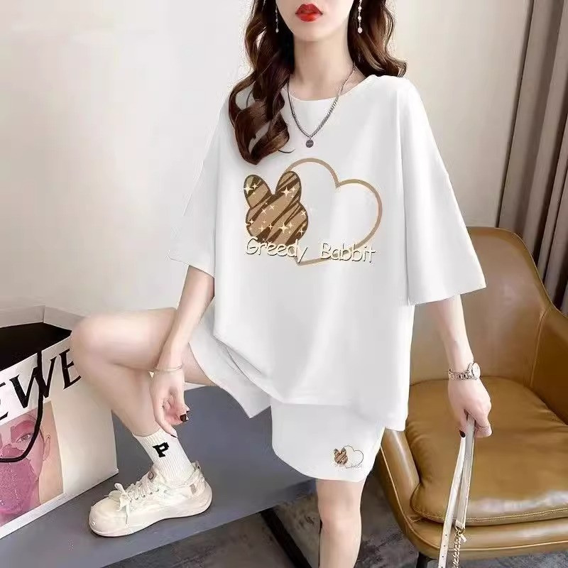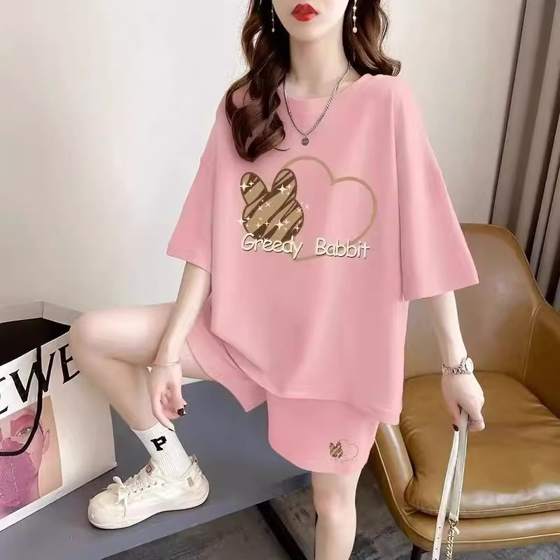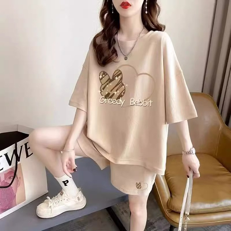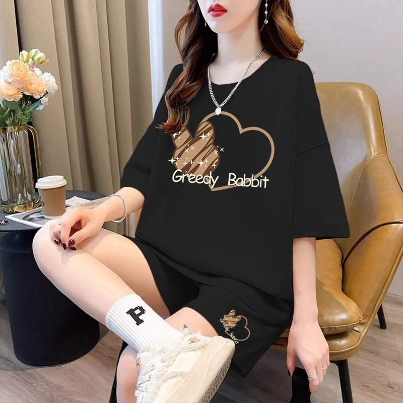 大码女装宽松纯棉休闲运动黑色套装女夏季胖mm洋气短袖短裤两件套