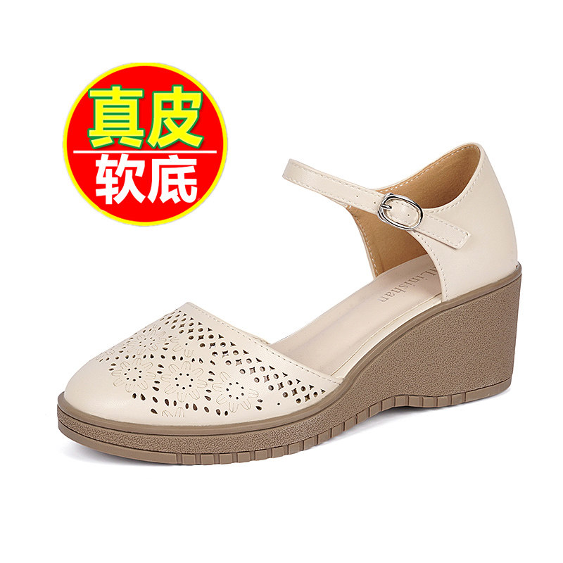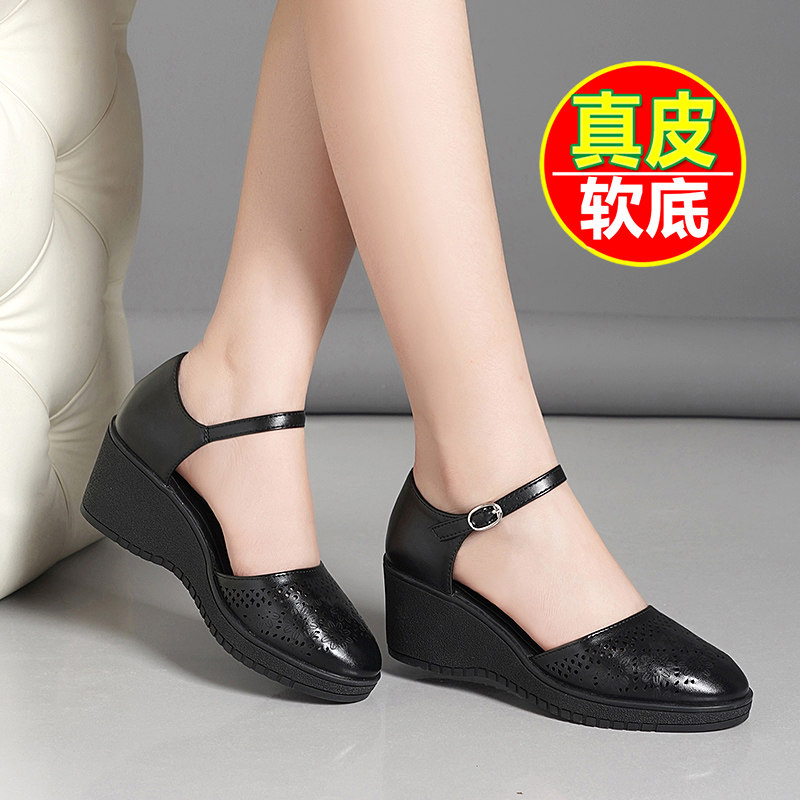 玛丽珍单鞋女一字扣厚底妈妈鞋夏季镂空包头凉鞋女真皮坡跟洞洞鞋