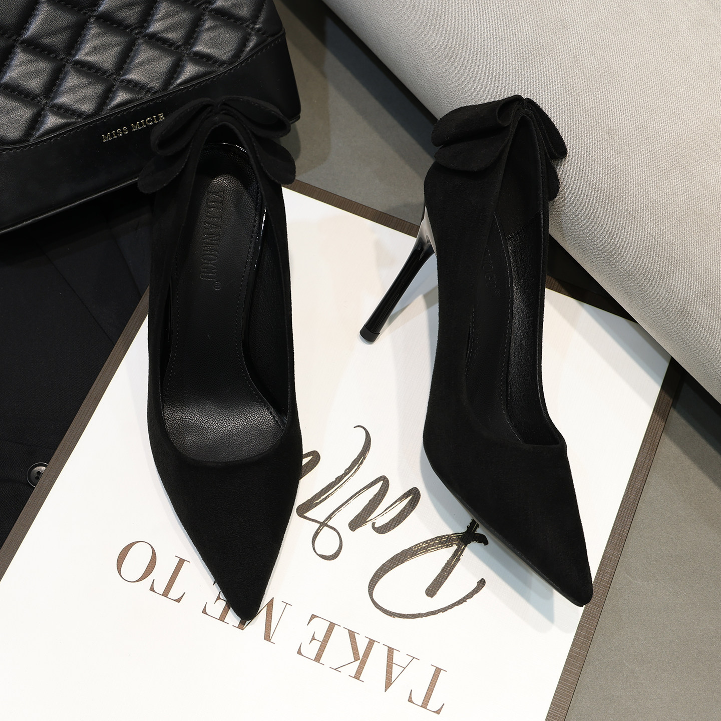 2026年新款春季法式少女黑色绒面尖头细跟女高跟鞋蝴蝶结单鞋女鞋