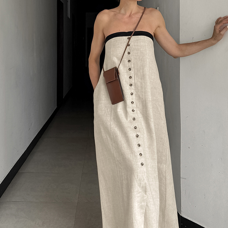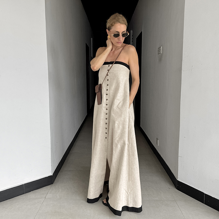 棉麻撞色抹胸长裙宽松遮肉显瘦