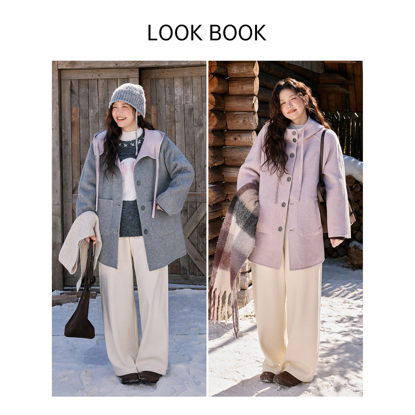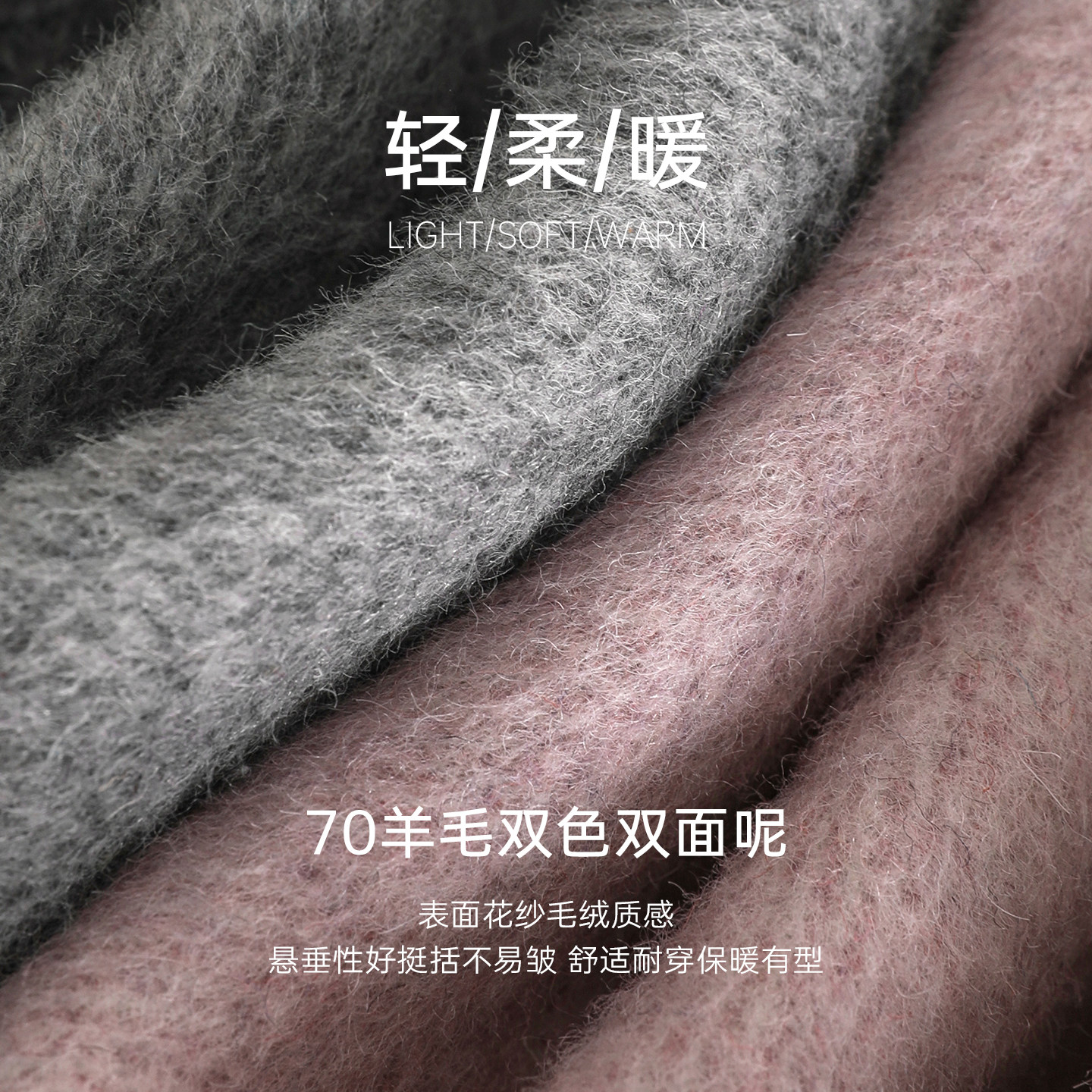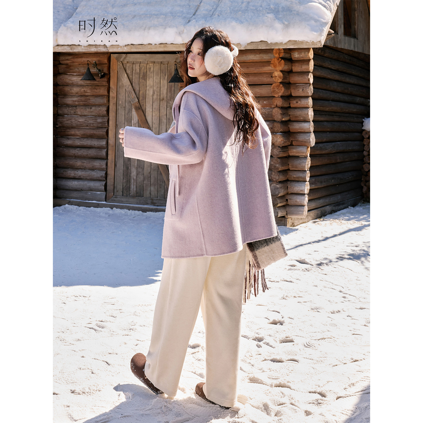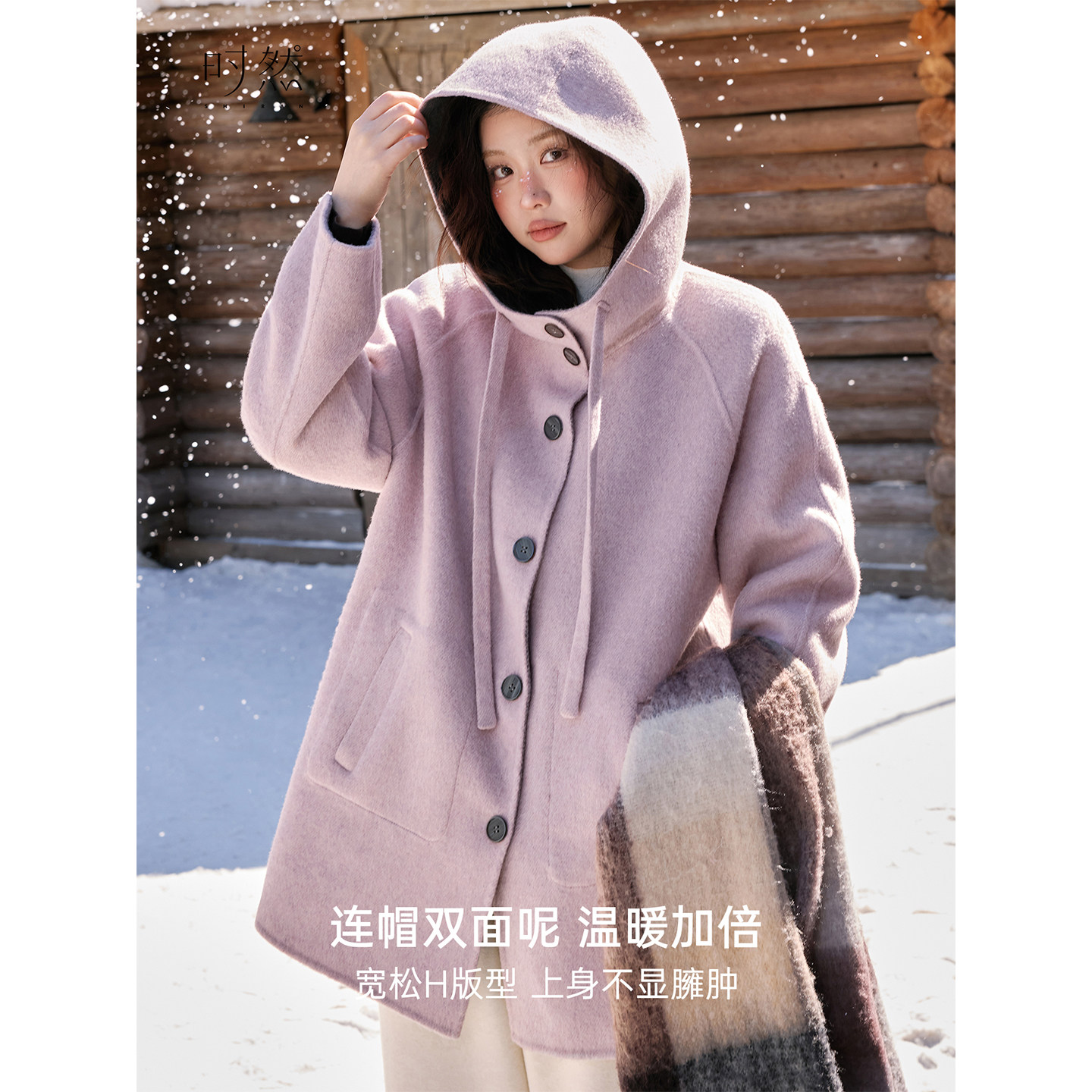 时然大码双面穿羊毛毛呢大衣微胖mm冬季加厚连帽外套中长款新女装