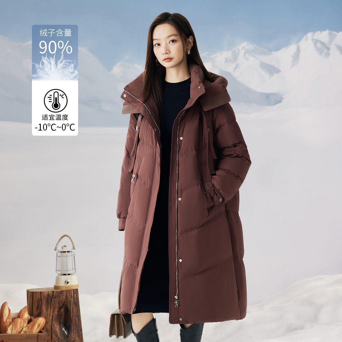 茵曼90白鸭绒通勤保暖过膝长款羽绒服女24年冬季百搭连帽厚外套
