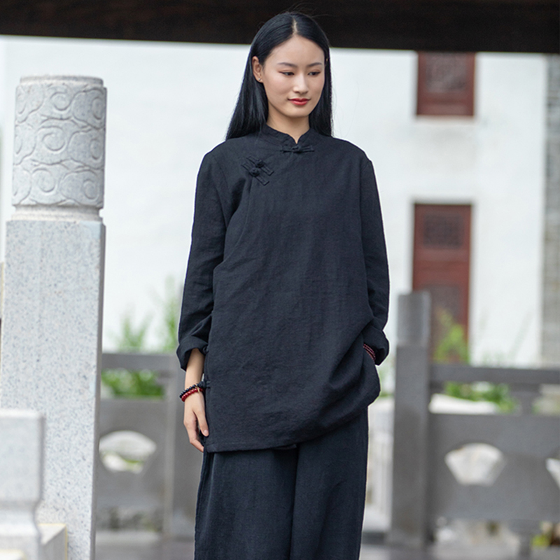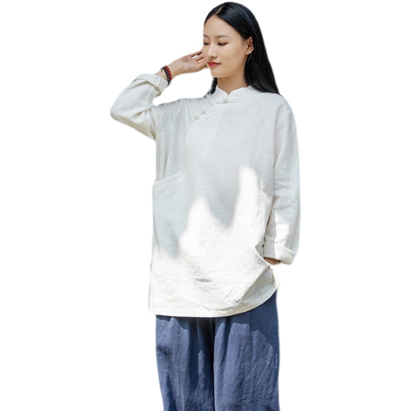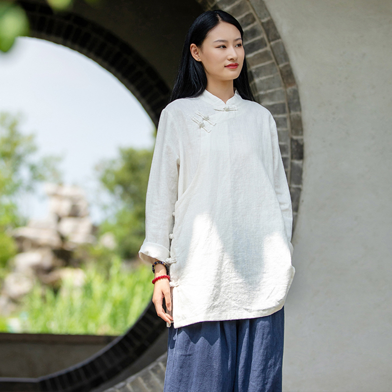 棉麻中国风立领衬衫复古中式斜襟盘扣宽松禅意中长款袍子唐装上衣