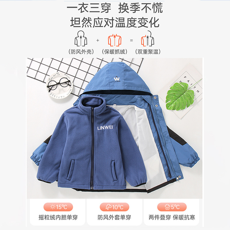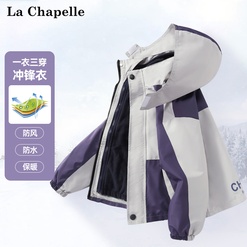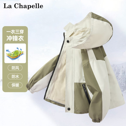 拉夏贝尔男童冲锋衣三合一秋冬2025新款中大童加绒冬装儿童外套