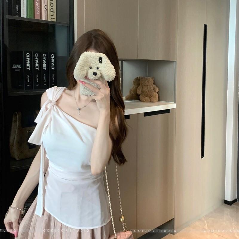 蝴蝶结绑带收腰斜肩小衫女夏季露肩不规则雪纺上衣阔腿休闲 裤套