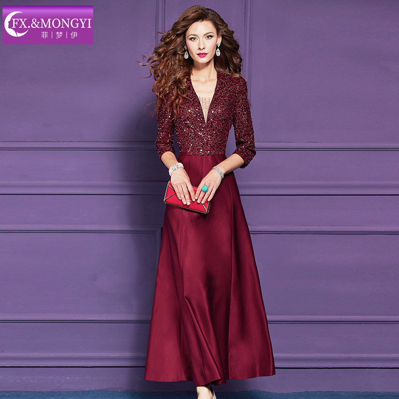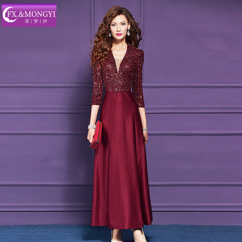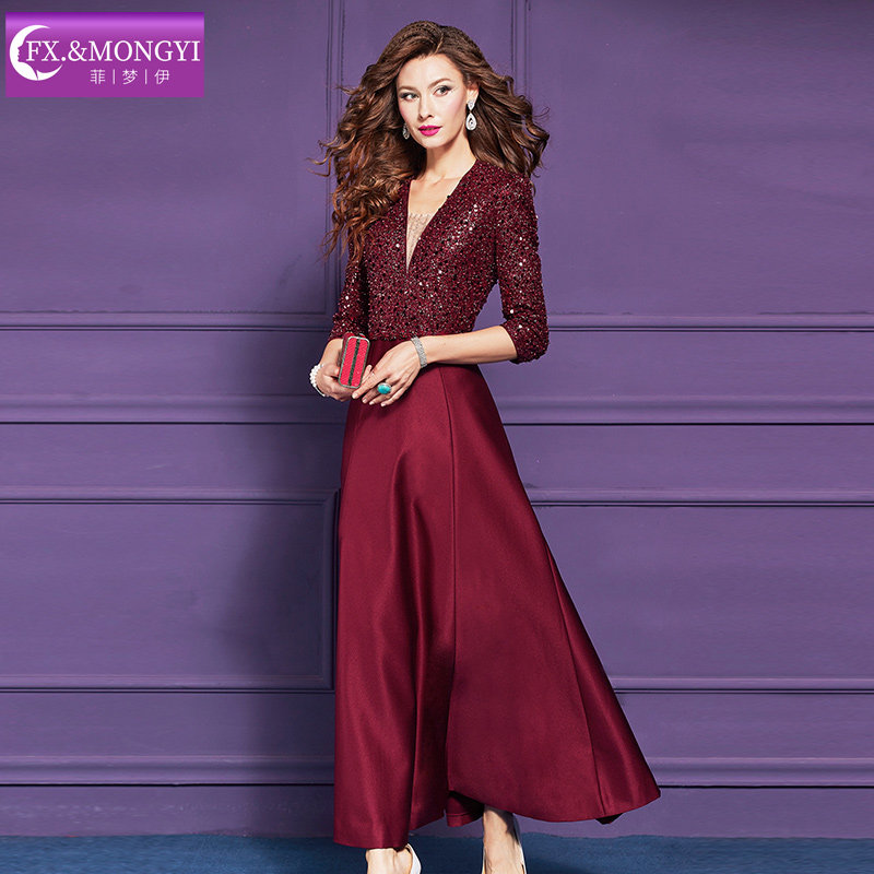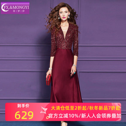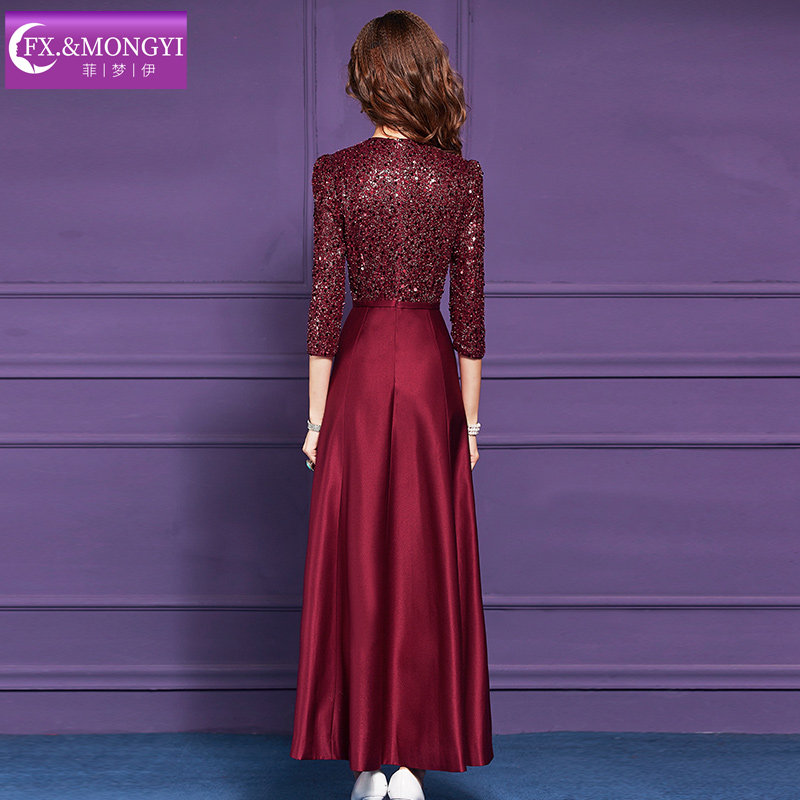 菲梦伊钉珠亮片红色连衣裙女冬季轻熟名媛本命年中长款礼服敬酒服