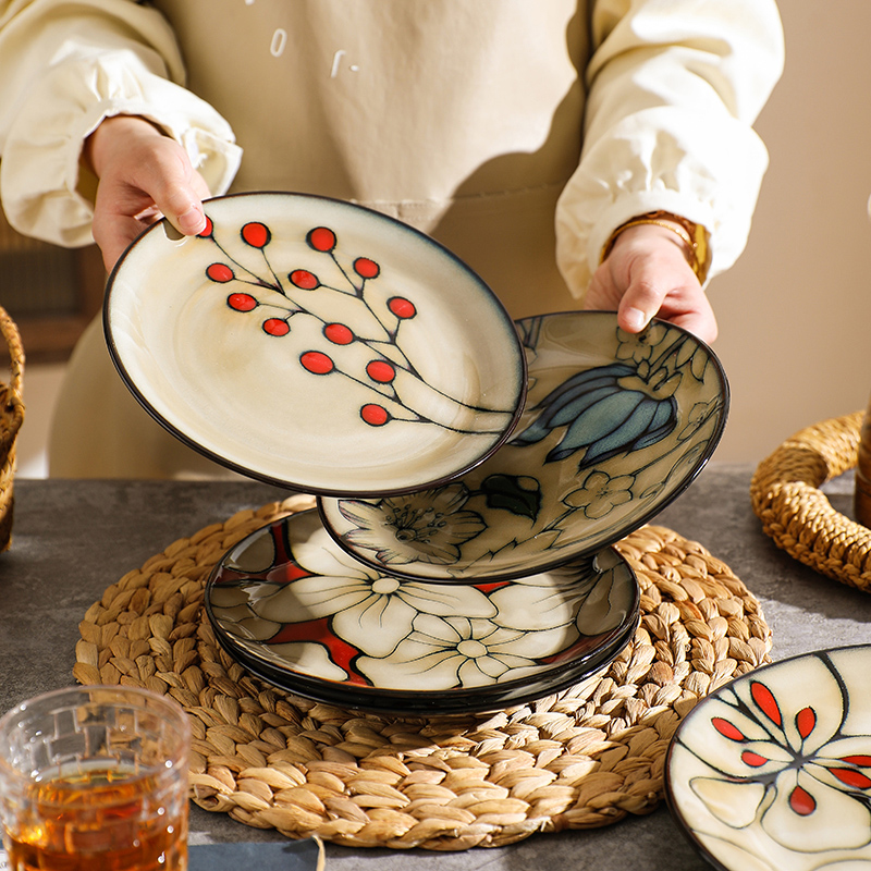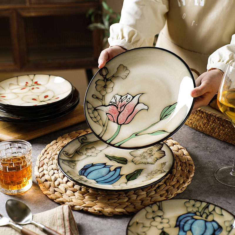 舍里轻奢复古花卉釉下彩菜盘平盘