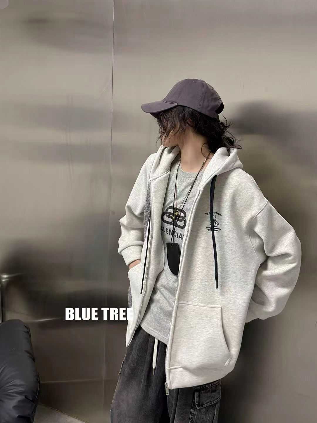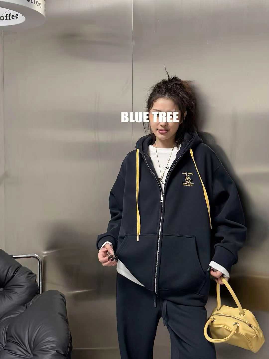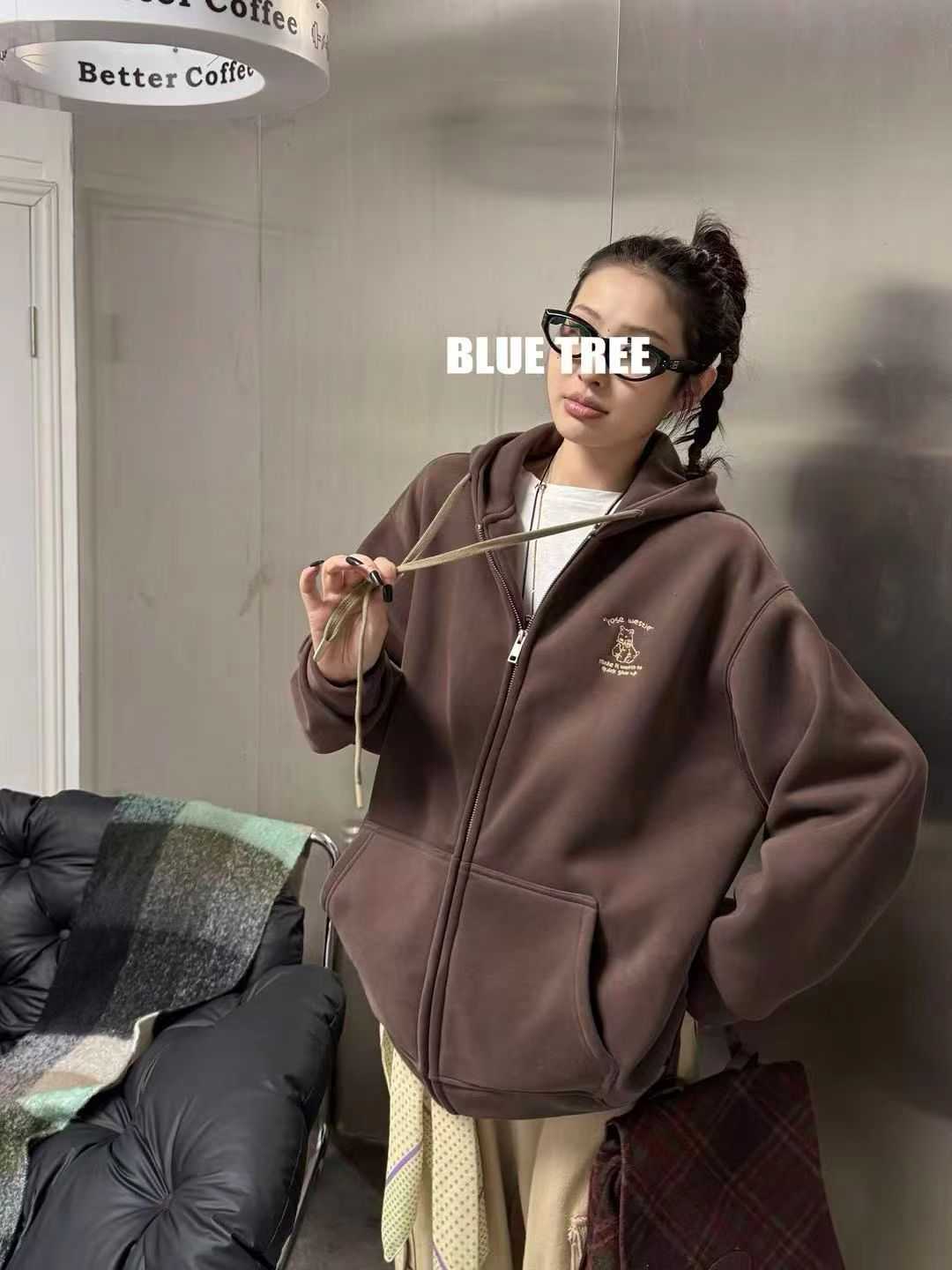 BLUETREE正品2025秋冬季新款连帽加绒开衫刺绣卡通卫衣女宽松外套