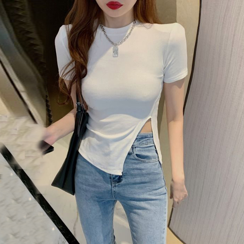 夏季短袖t恤女百搭圆领开叉洋气黑色修身不规则性感上衣打底小衫