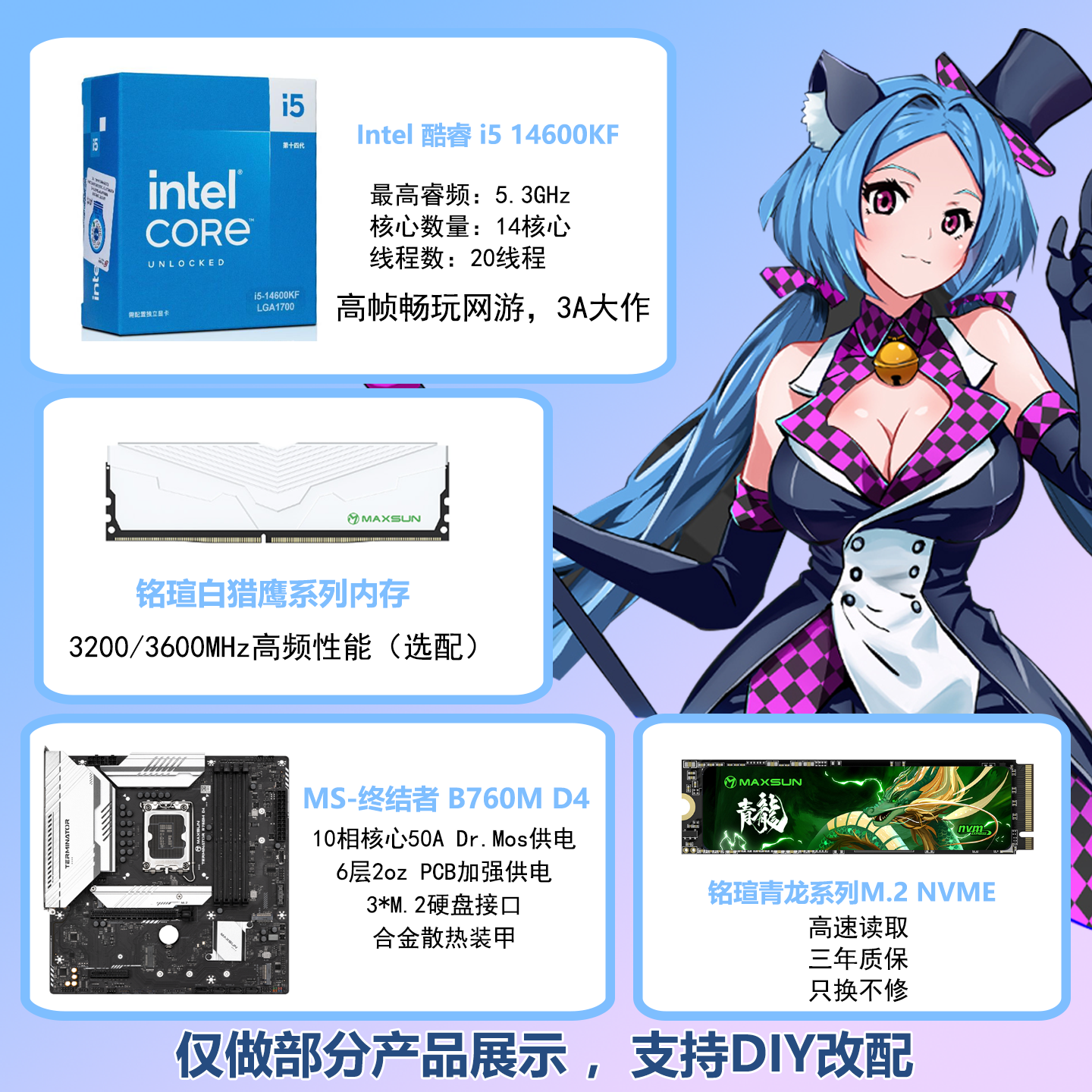 【intel无卡主机】英特尔酷睿i5 12600KF/14600KF/265K Ultra7铭瑄DIY电脑主机台式机组装直播游戏电竞整机