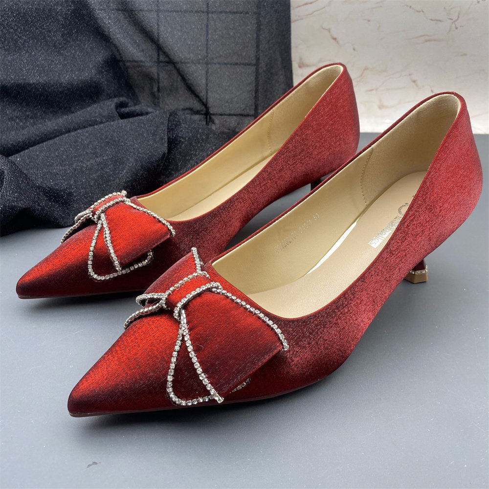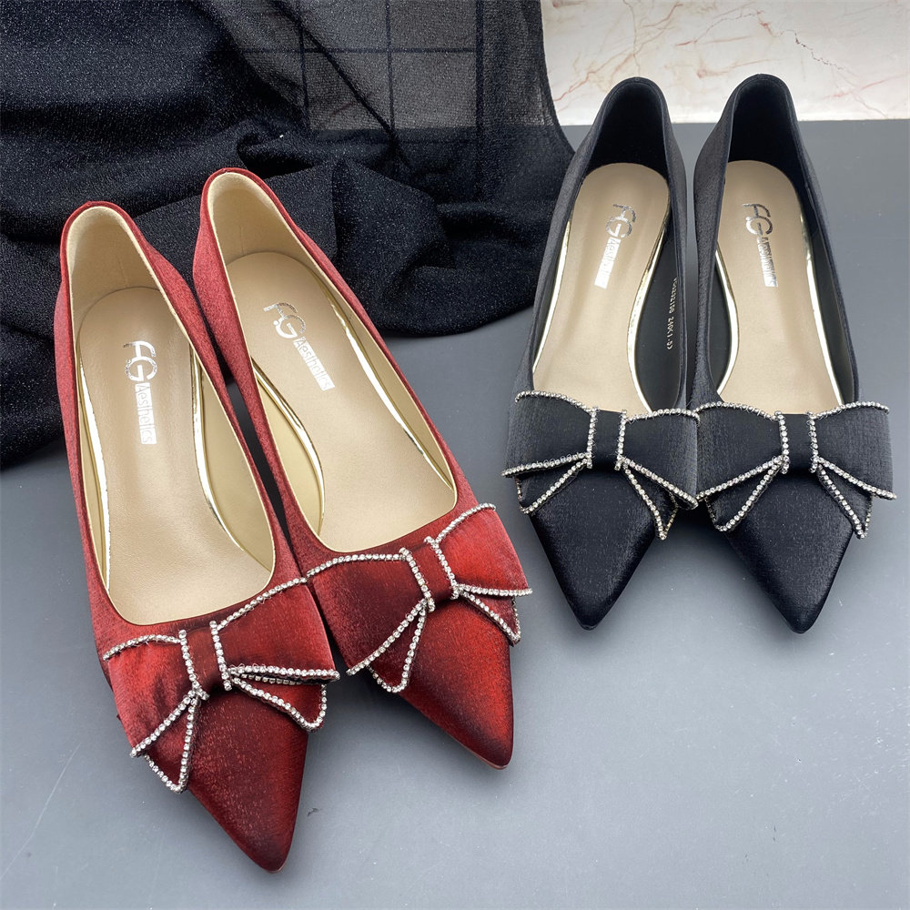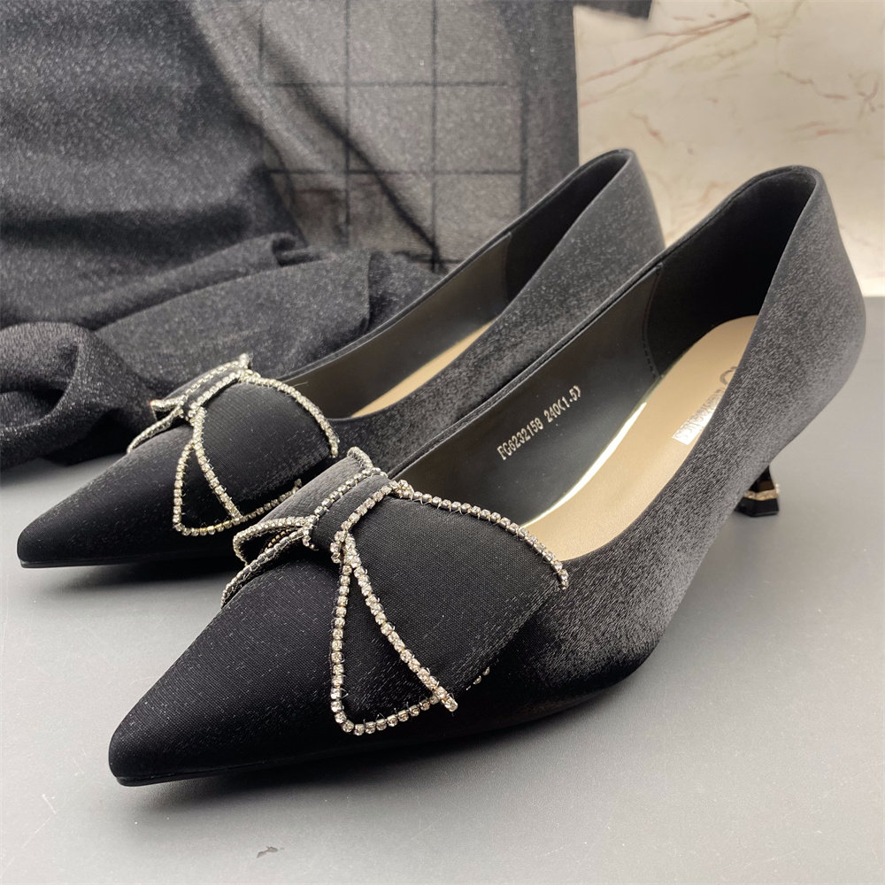 羊皮鞋垫尖头细跟高跟鞋 蝴蝶结浅口水钻真皮脚肥脚胖装脚单鞋女