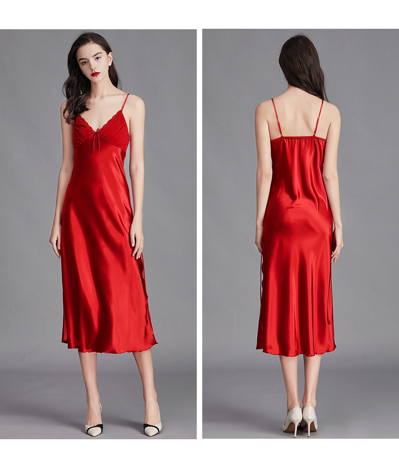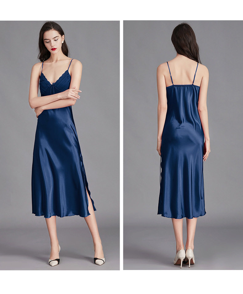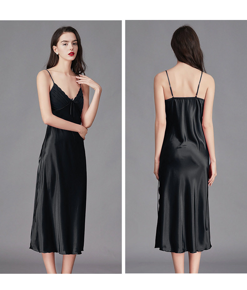 冰丝修身加长款吊带睡裙性感开叉夏女仿真丝黑色连衣裙外穿打底裙