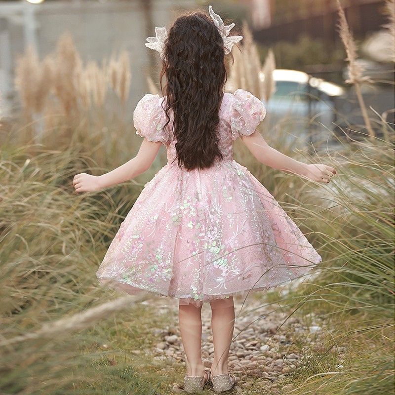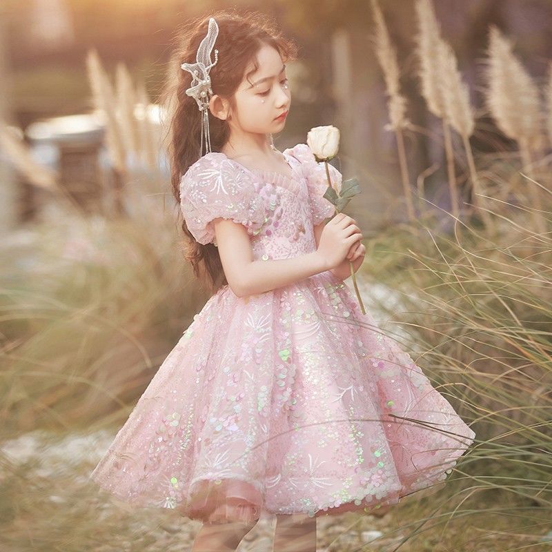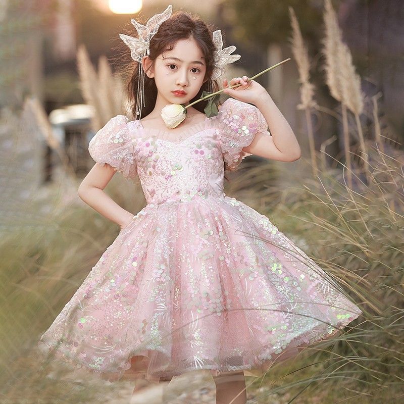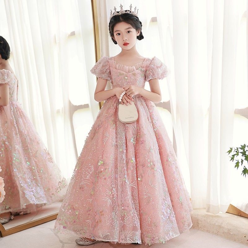 粉色大码超仙泡泡袖公主裙小女孩花童亮片重工钢琴主持人模特礼服