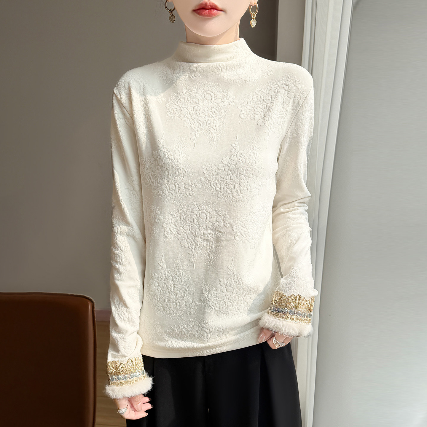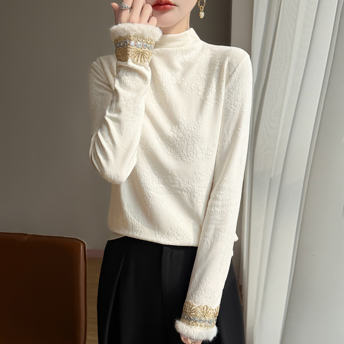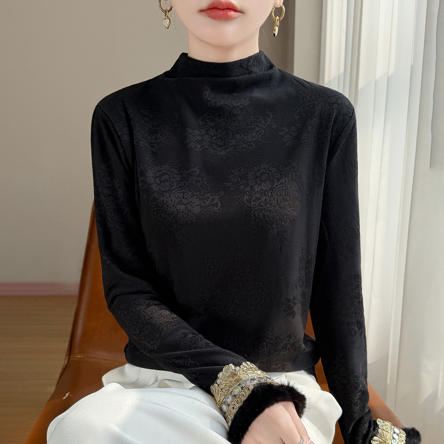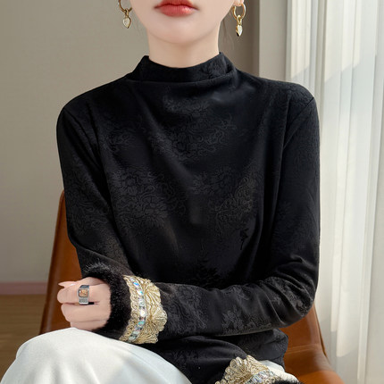 加绒新中式刺绣衬衫打底衫女国风马甲内搭黑色半高领长袖加厚t恤