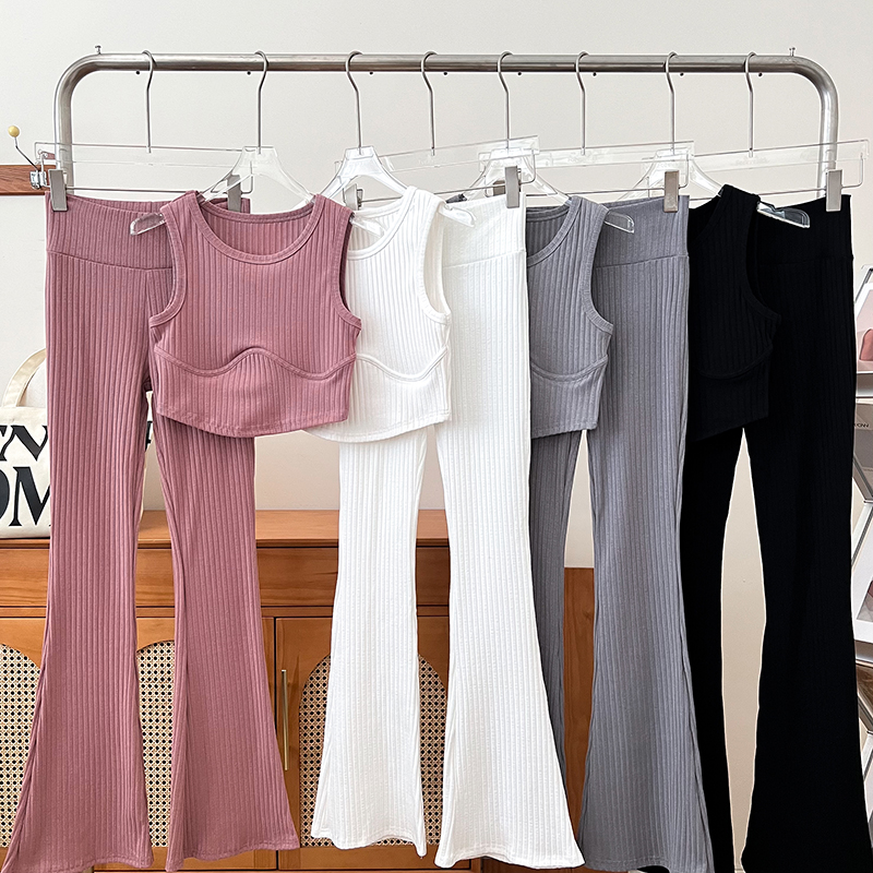 时尚百搭圆领无袖背心上衣+高腰显瘦微喇叭裤休闲裤长裤两件套女