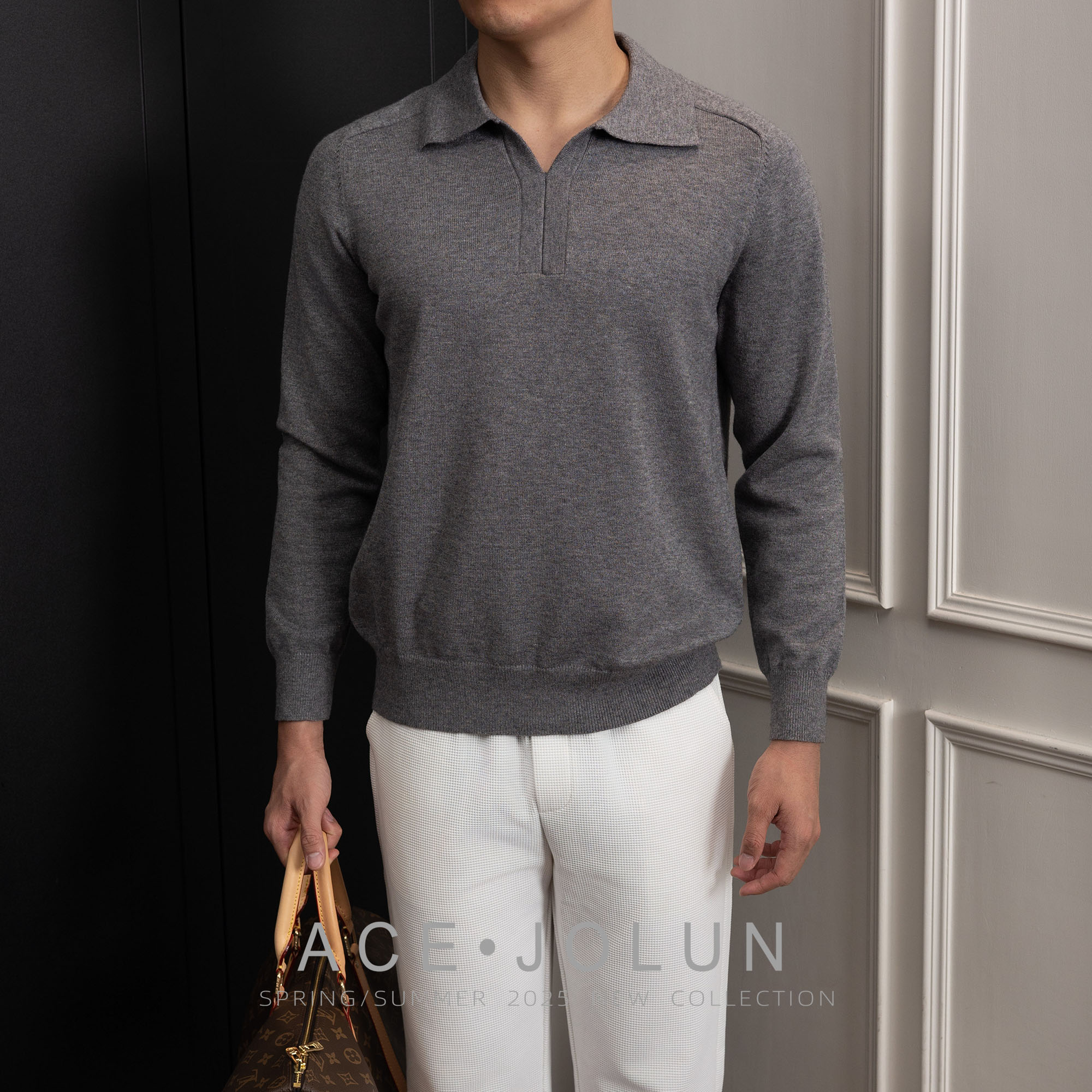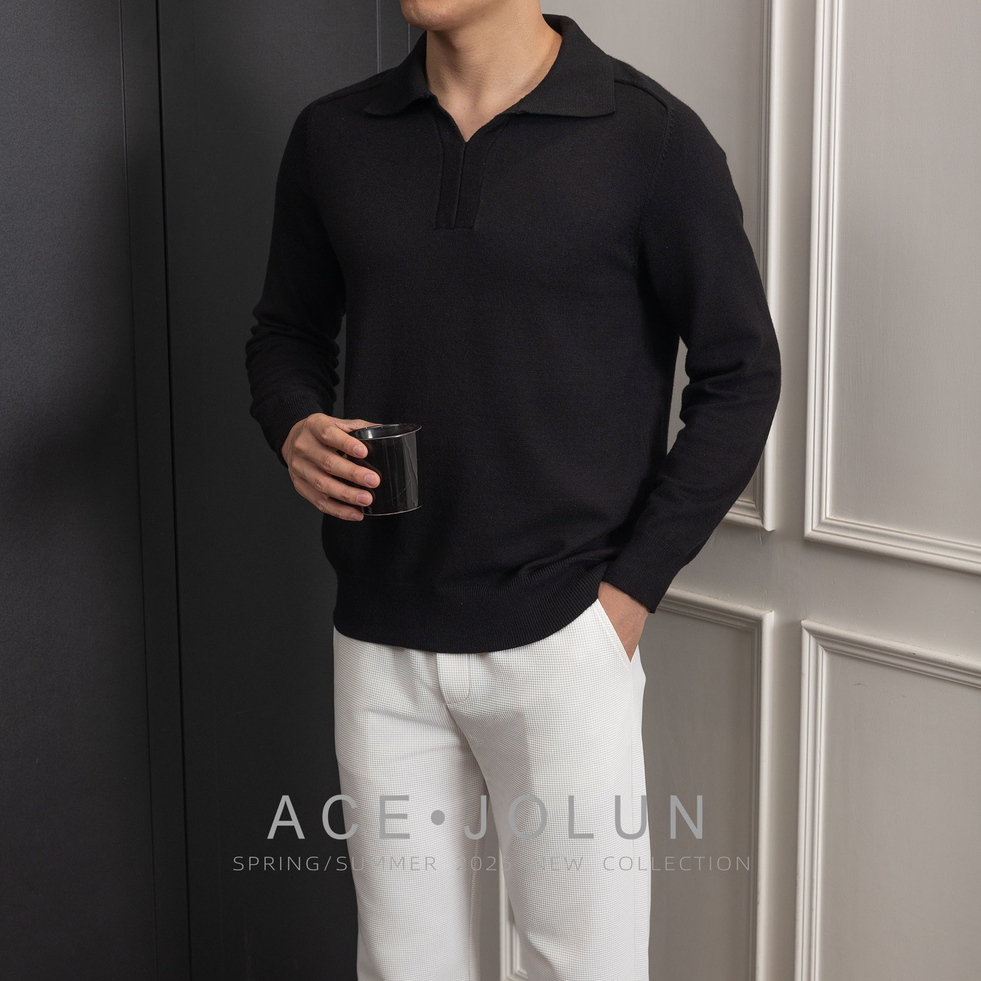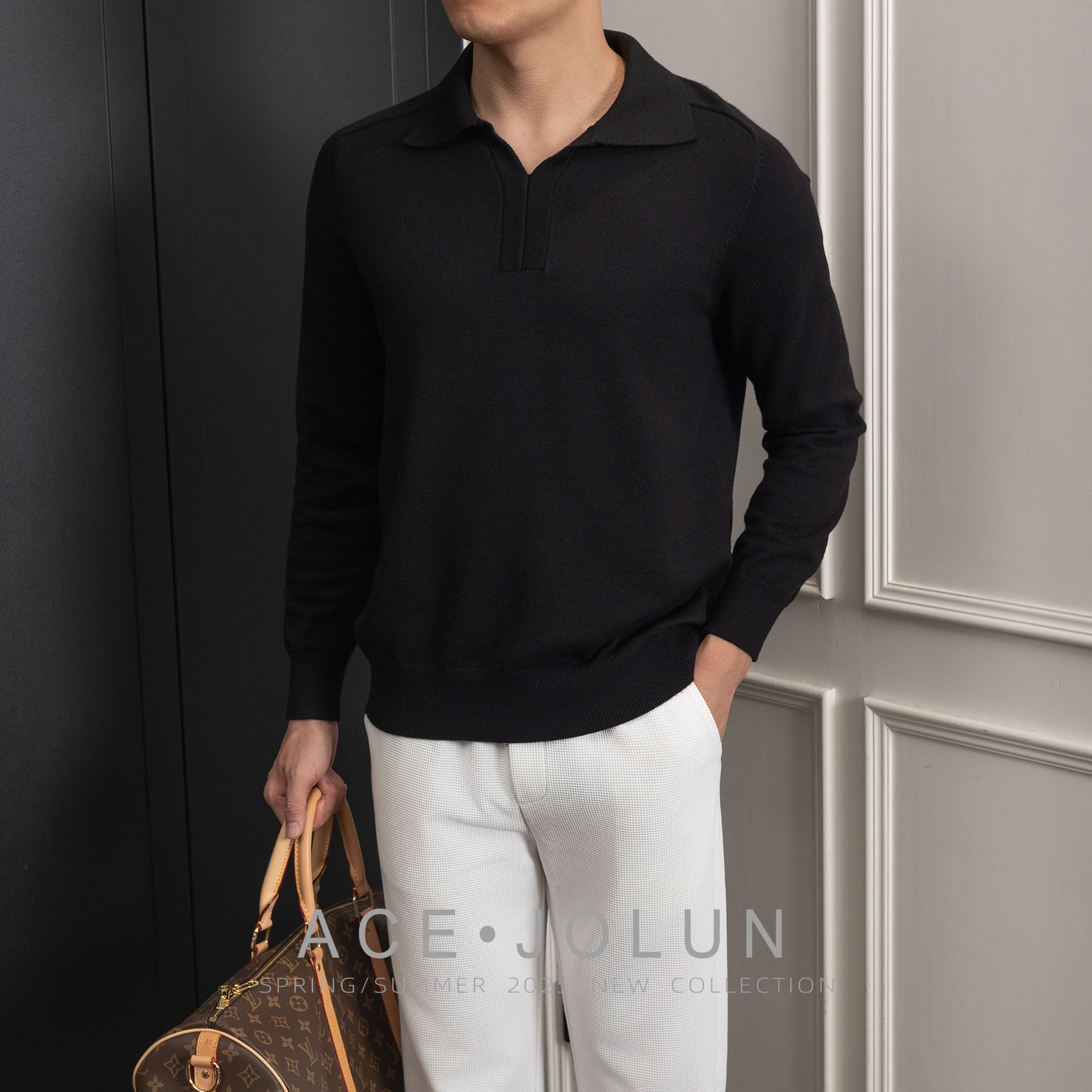 黑色POLO领长袖针织衫男秋冬季老钱风加厚内搭打底衫男士套头毛衣