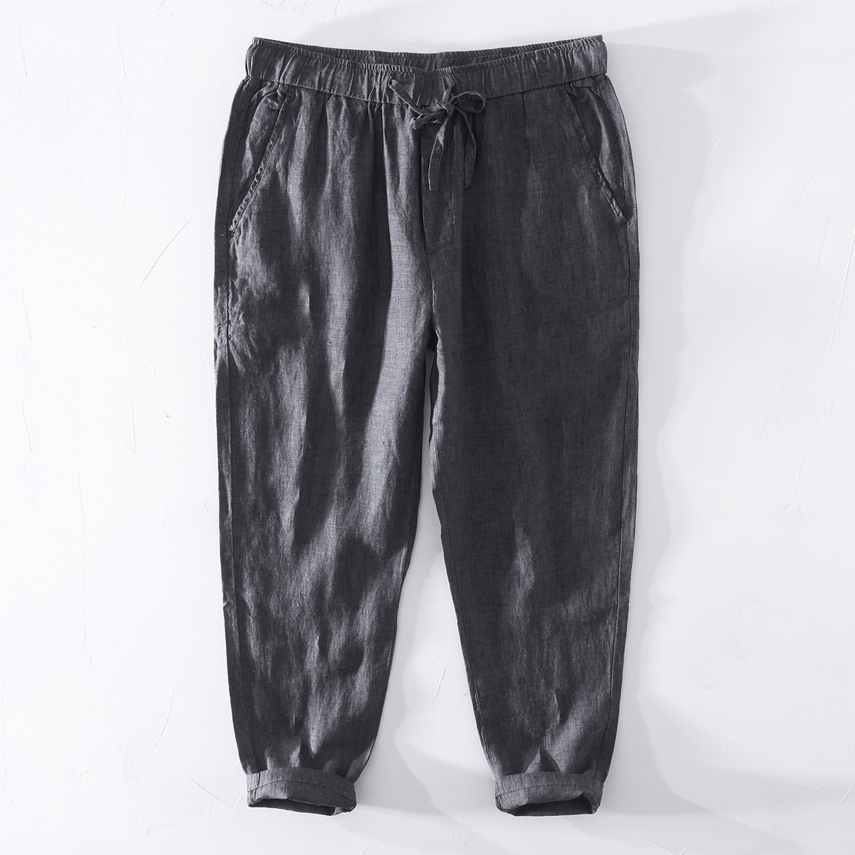 极麻清新抽绳薄款松紧腰亚麻休闲裤男士透气宽松直筒棉麻九分裤潮