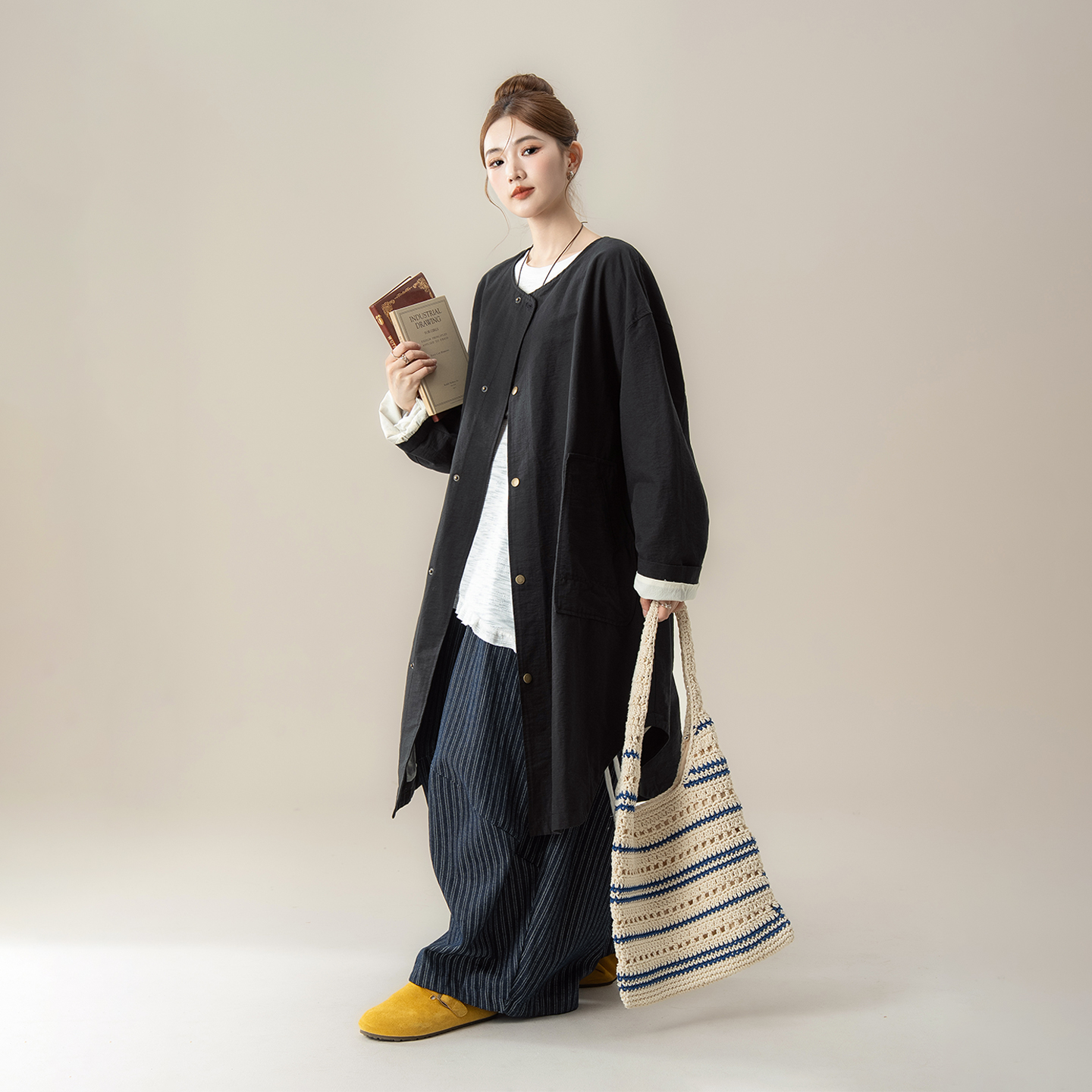 黑色日系中长款风衣外套女秋季新款宽松显瘦大口袋设计感休闲上衣
