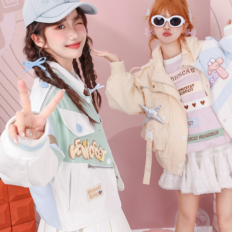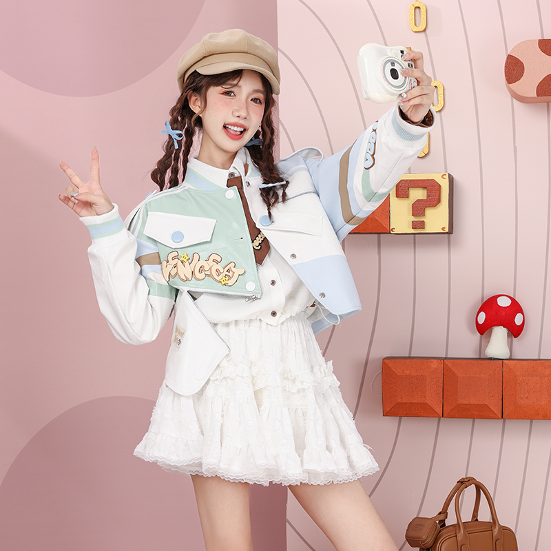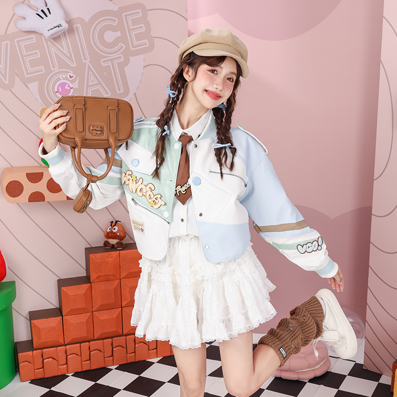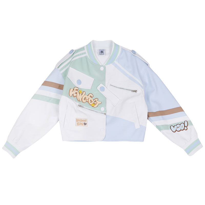25秋甜酷机车风蓝绿白拼色刺绣字母撞色螺纹短款皮夹克PU皮衣外套