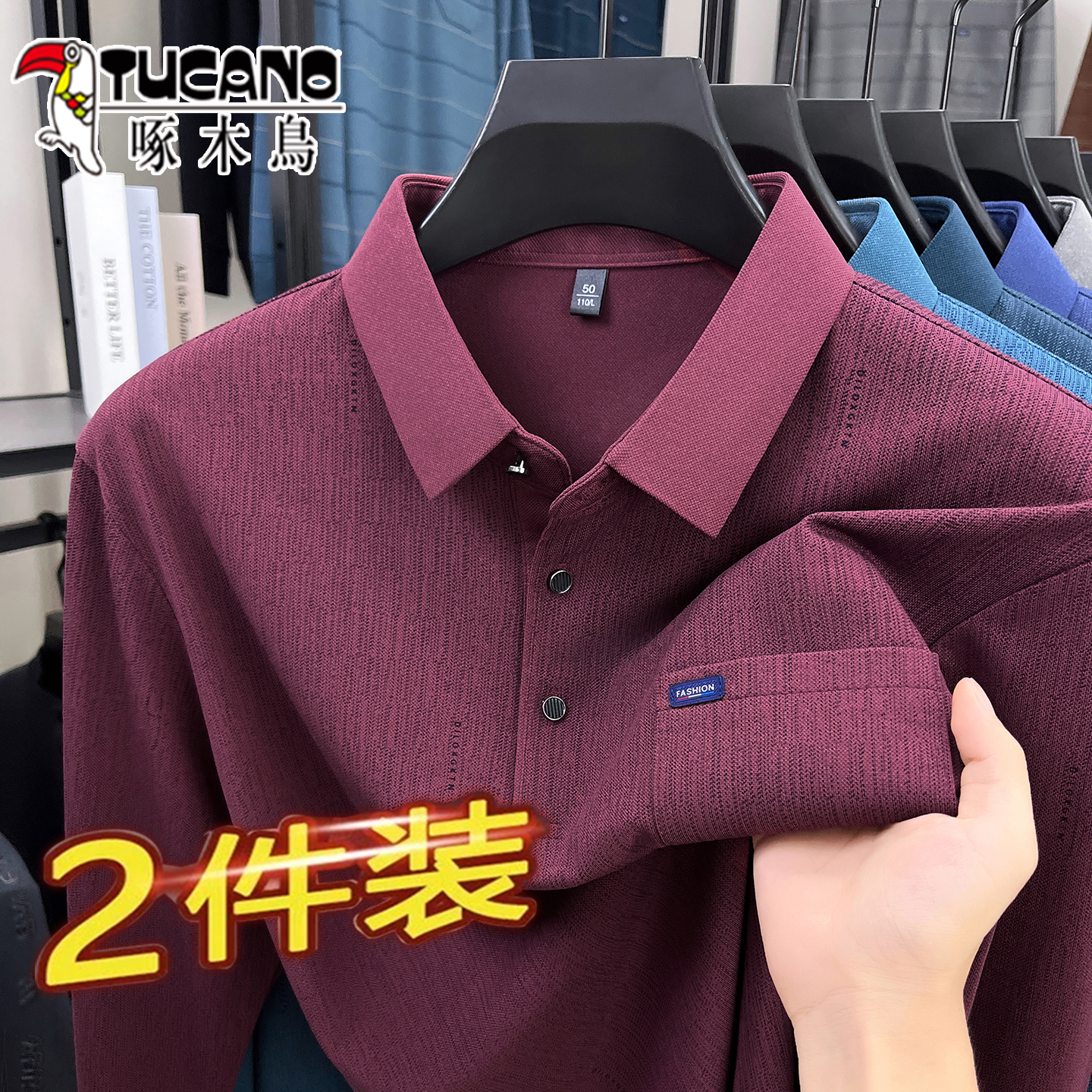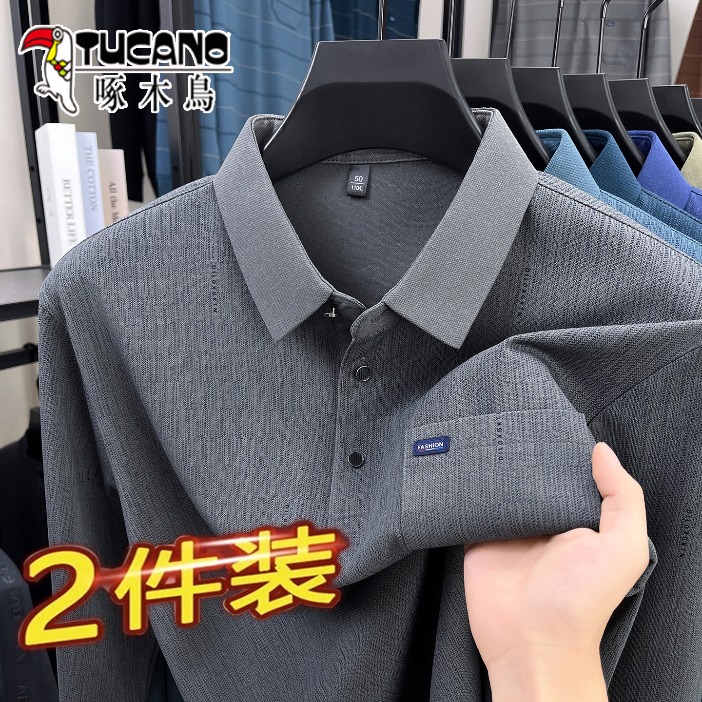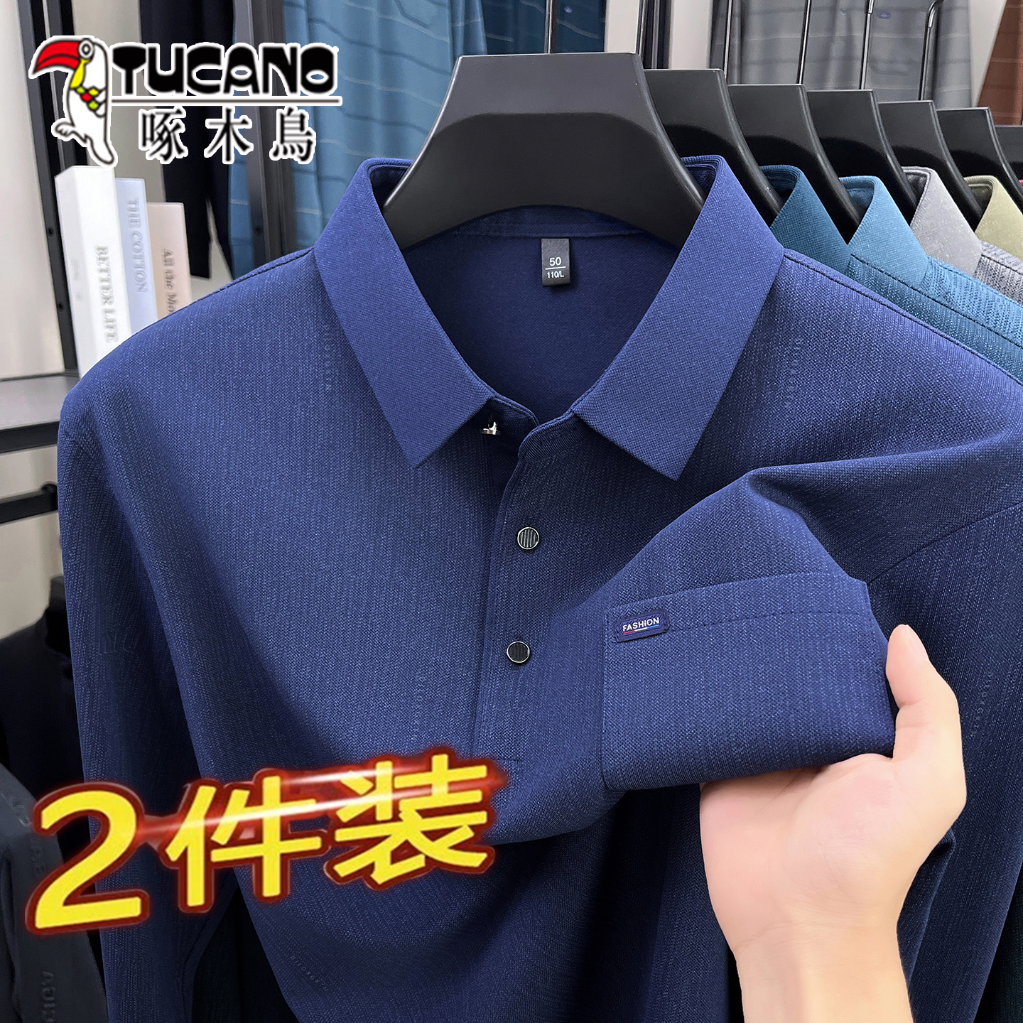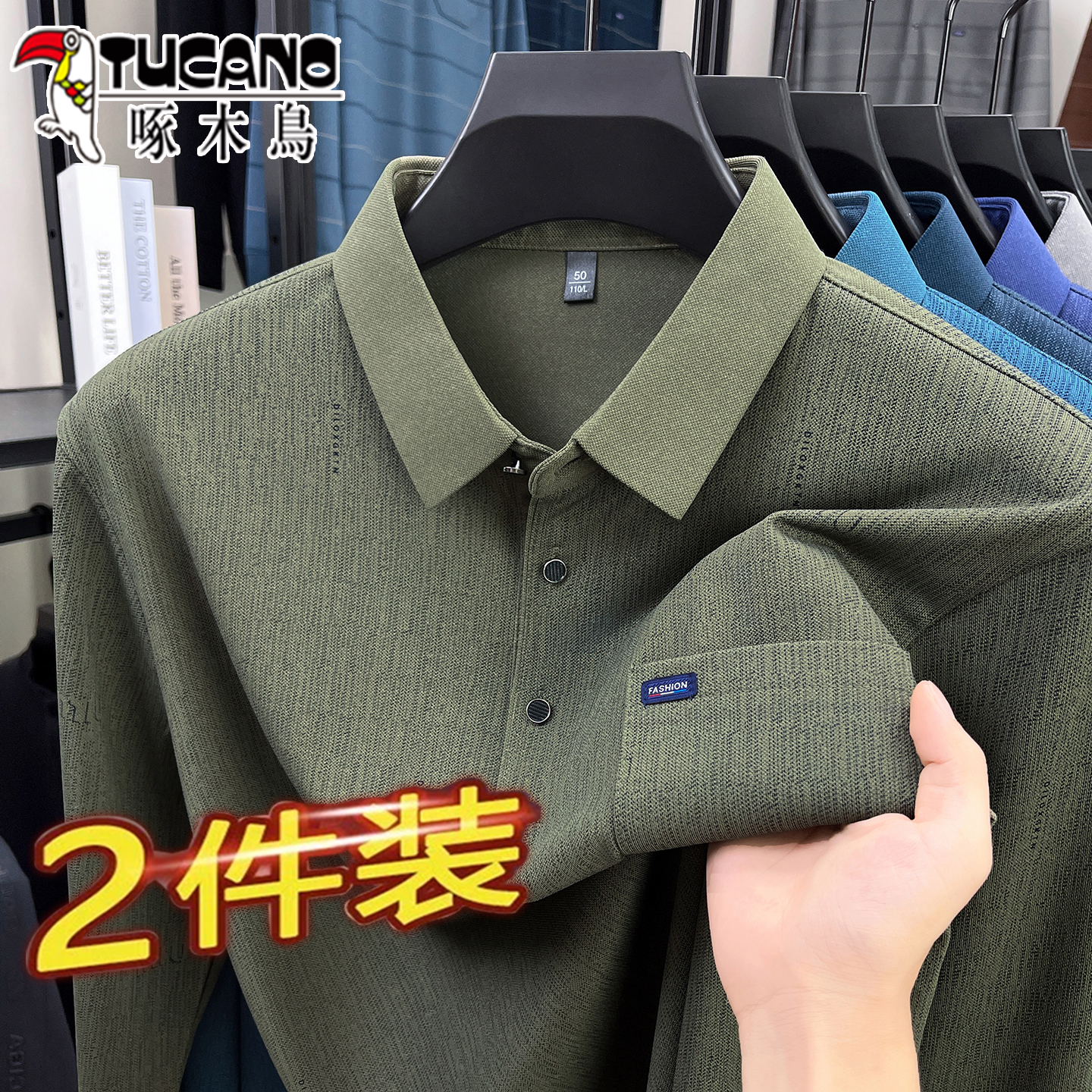 啄木鸟2025秋季新款中老年男士长袖t恤纯棉口袋爸爸翻领上衣秋衣