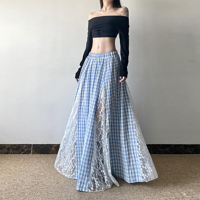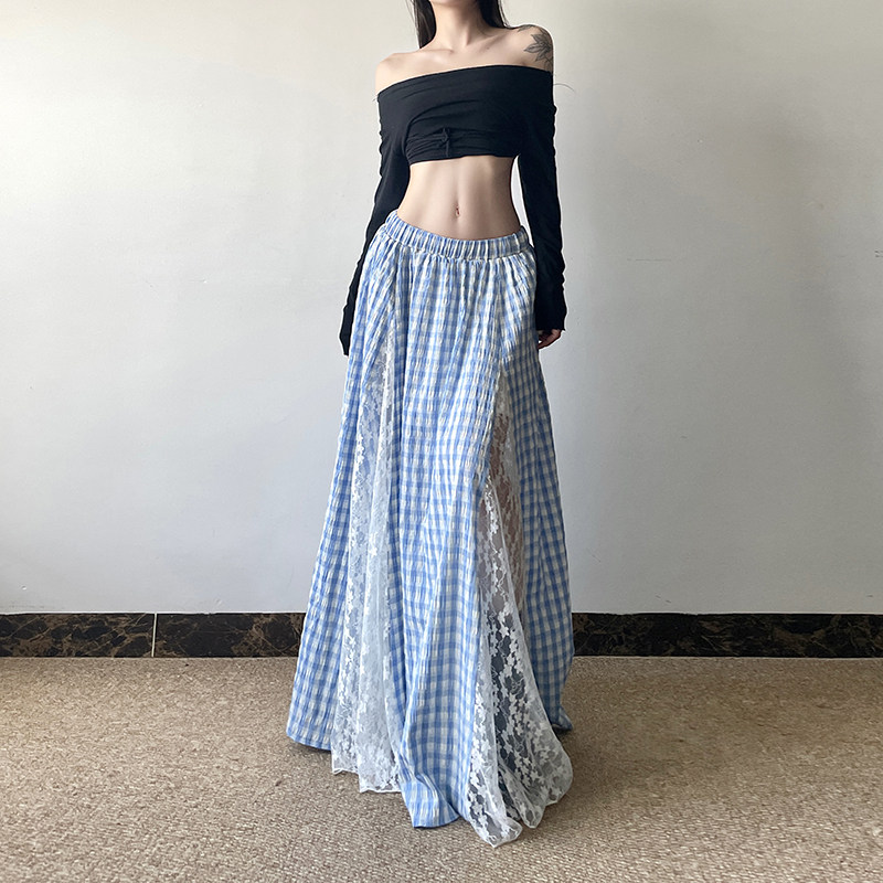 gagaopt自制新款蕾丝花边拼接蓝色格纹半身裙松紧腰显瘦A字长裙秋