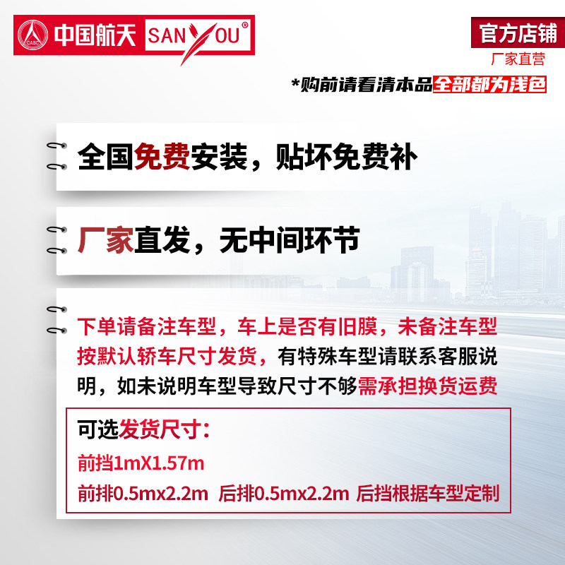 中国航天SANYOU山由汽车贴膜高清前挡风主副驾两门前排防晒隔热膜