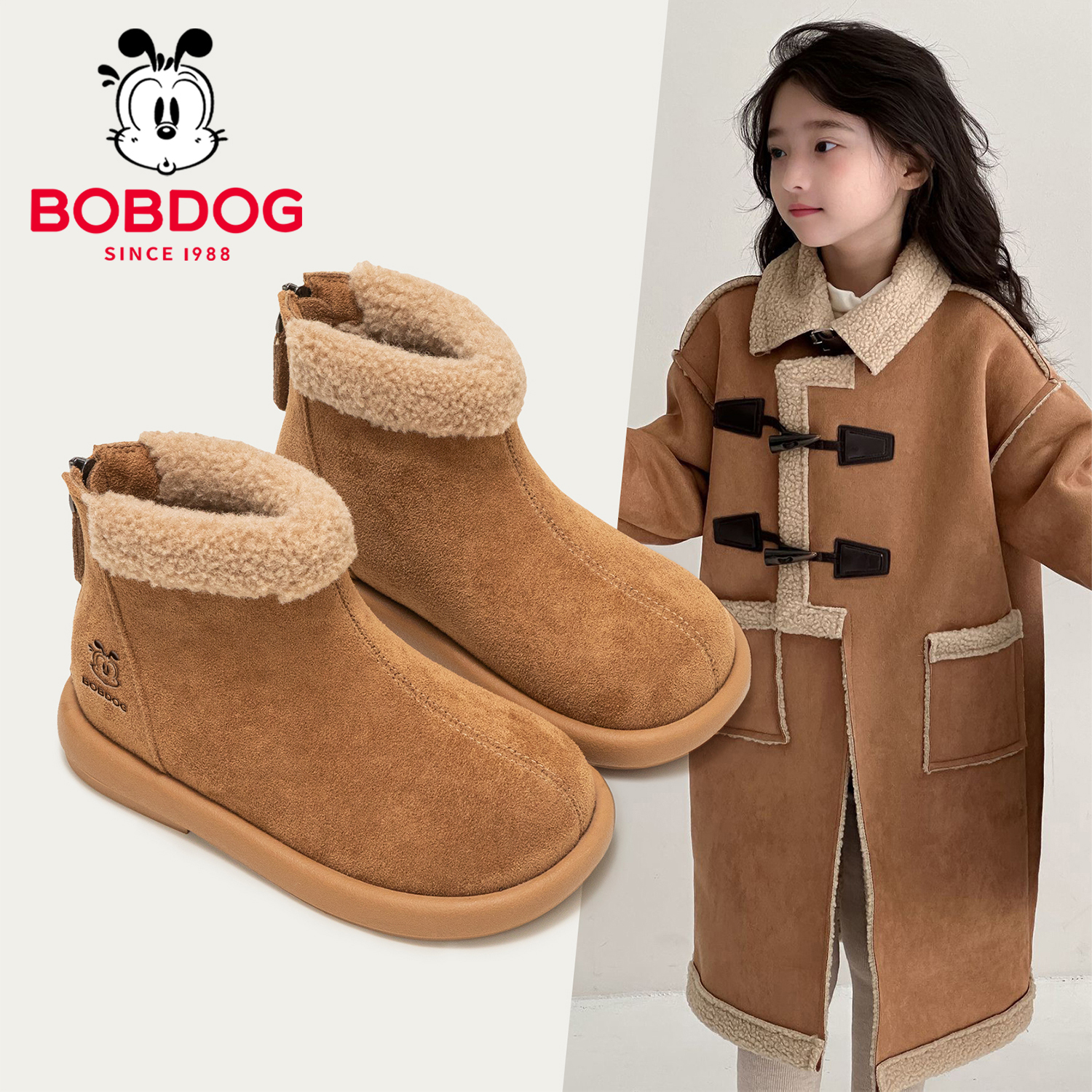 巴布豆真皮女童棉鞋雪地靴加绒2025新款冬季儿童靴子加厚短靴棉靴