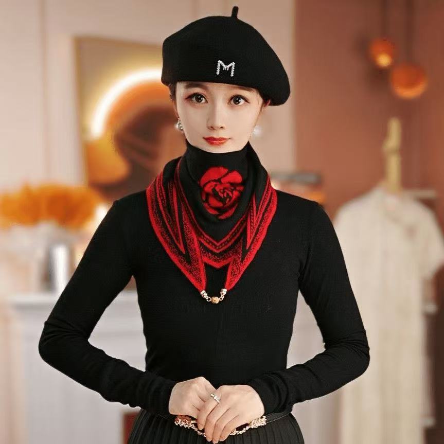 秋冬妈妈款山茶花磁吸扣围巾女护颈保暖百搭针织双面三角巾围脖