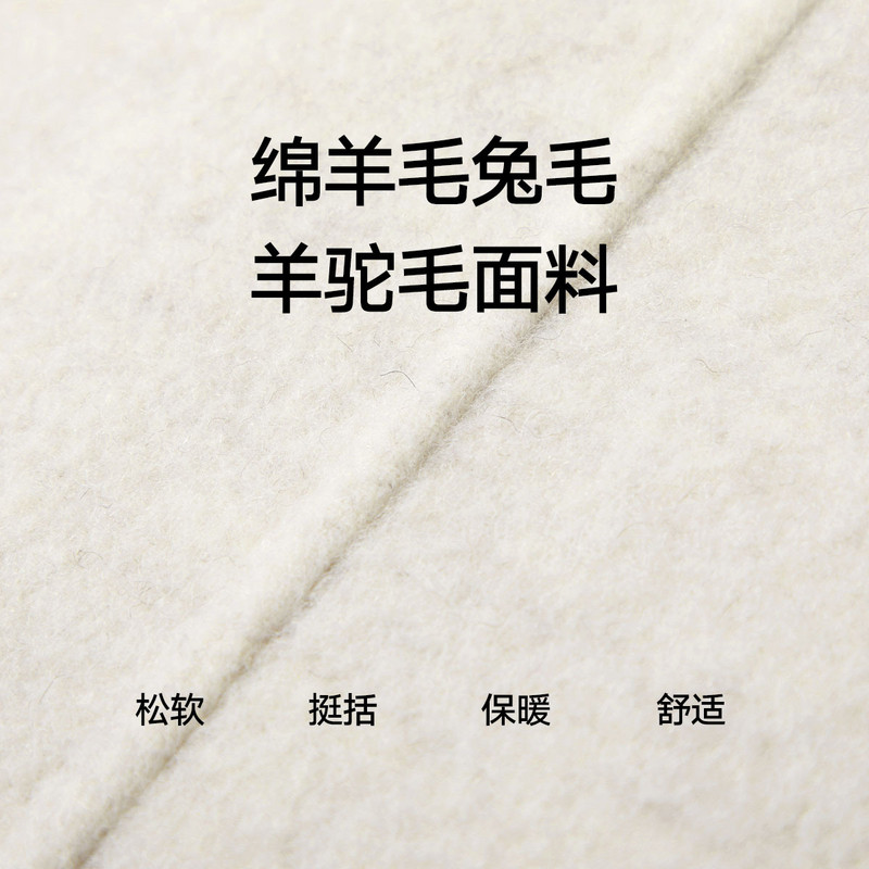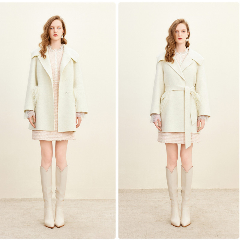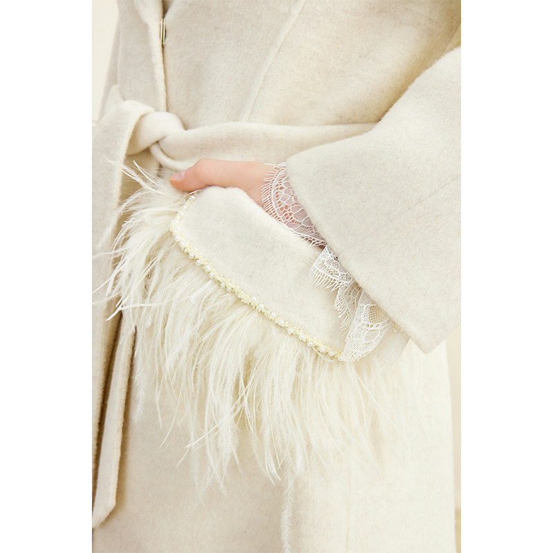 MISSCOCOON千金风珍珠花边鸵鸟毛装饰可拆腰带米色毛呢大衣
