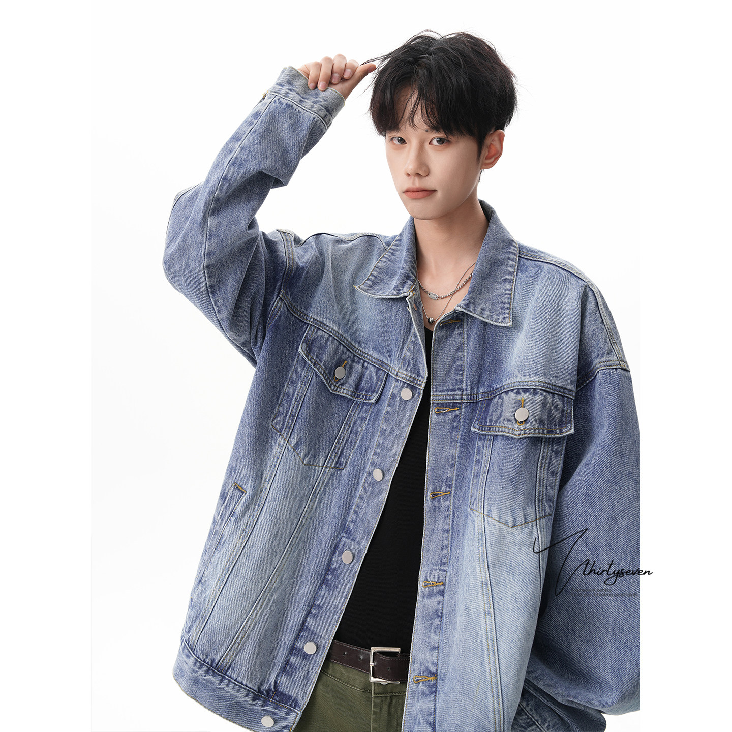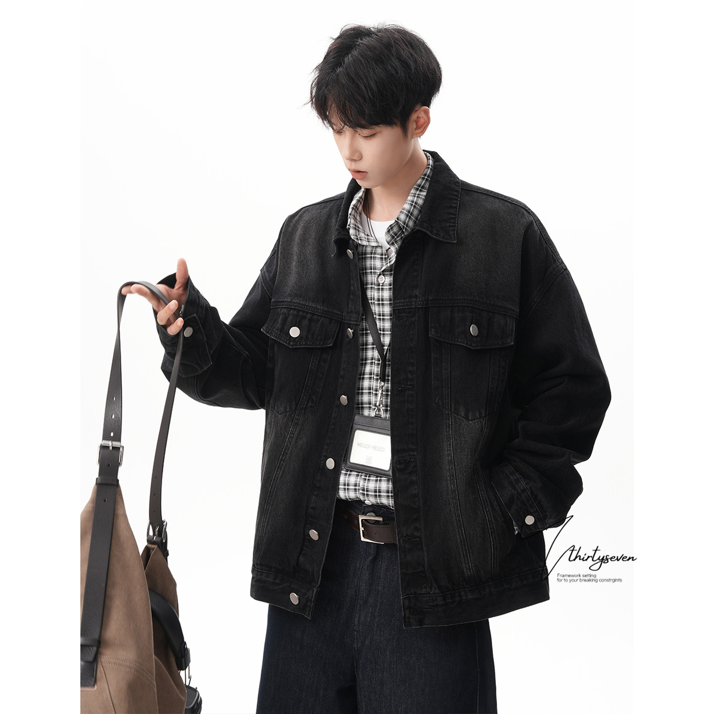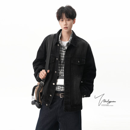 V37美式复古黑色翻领牛仔外套男春潮牌小众宽松休闲情侣夹克上衣