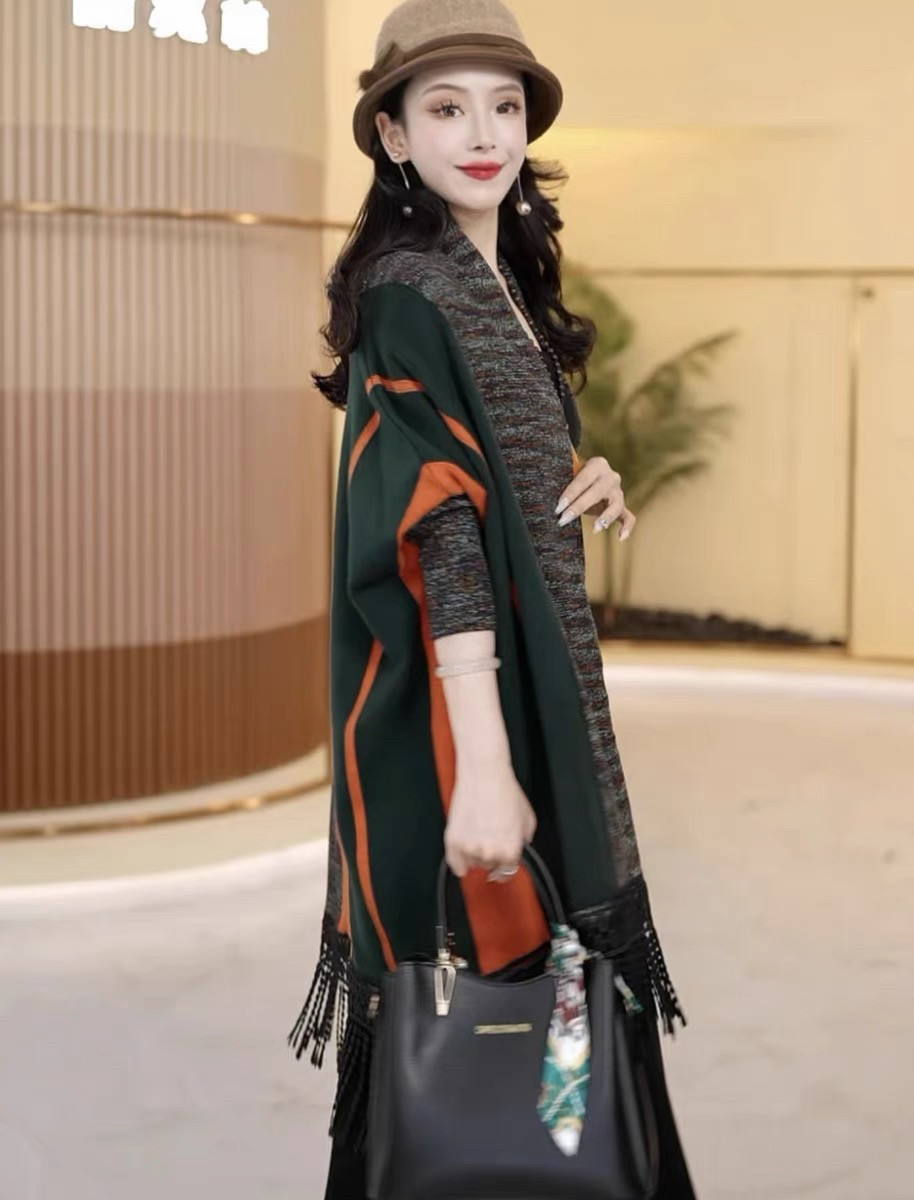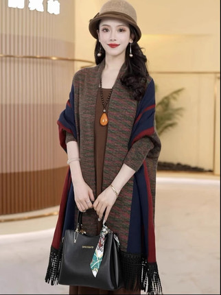 2024秋季新款蝙蝠长袖流苏针织开衫中长款时尚披肩大码减龄外套女