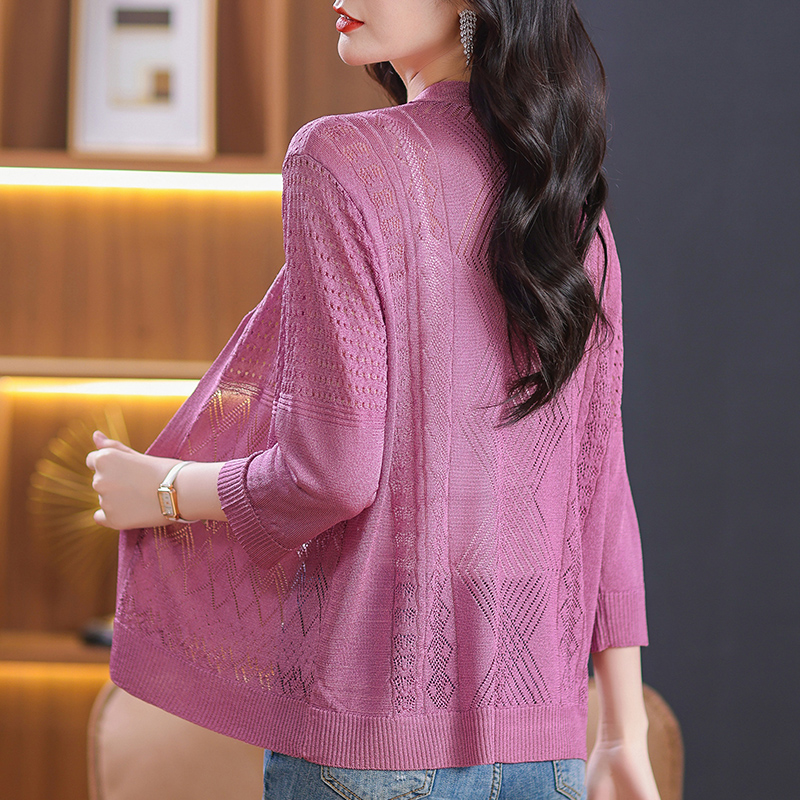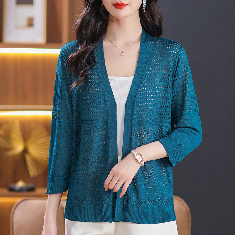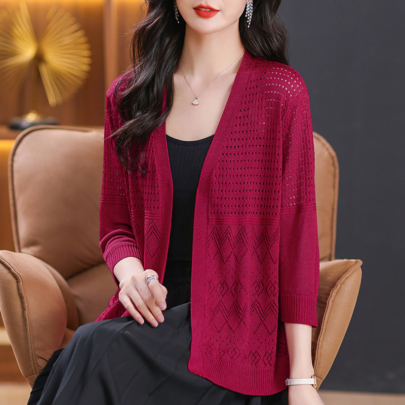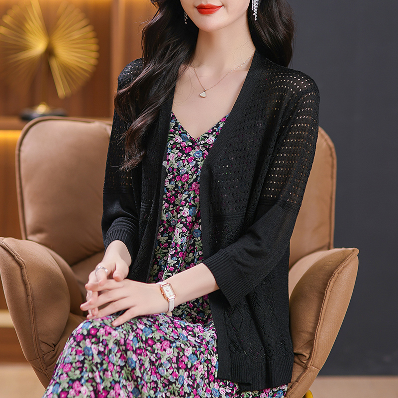 镂空针织上衣妈妈装披肩V领开衫