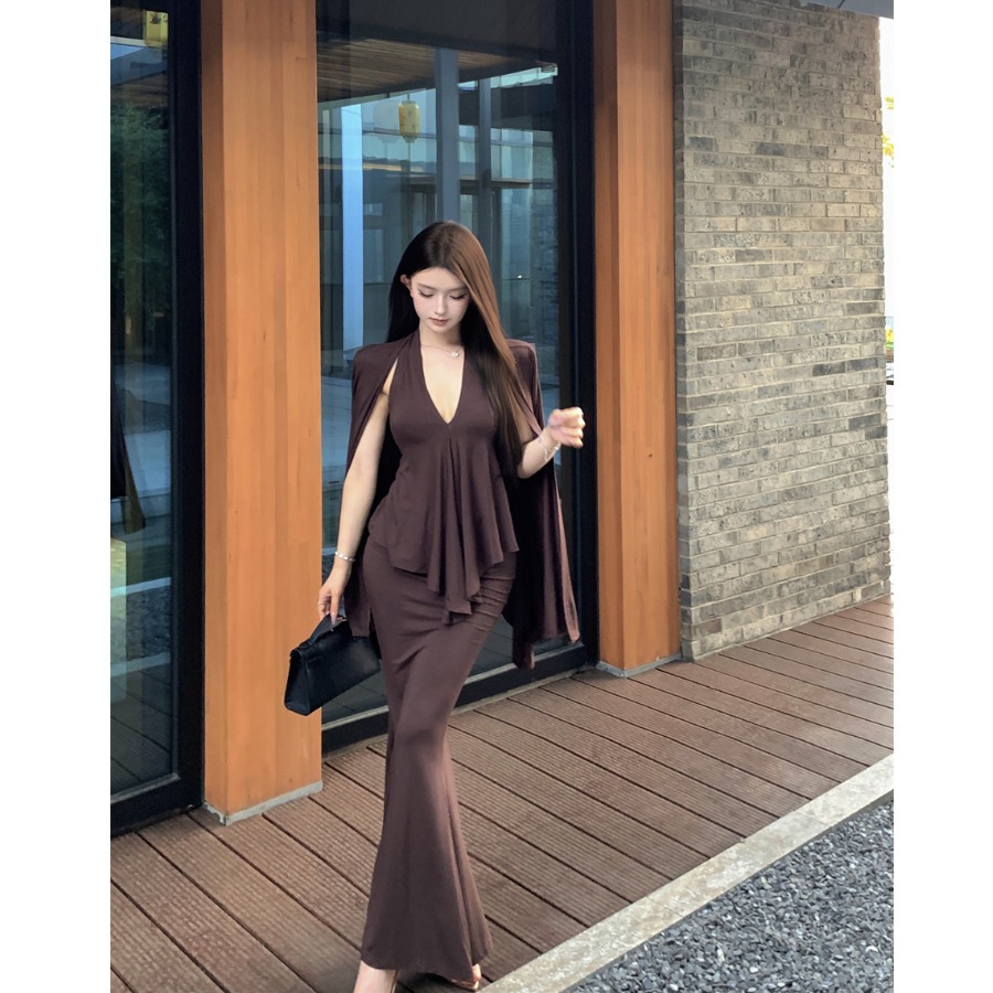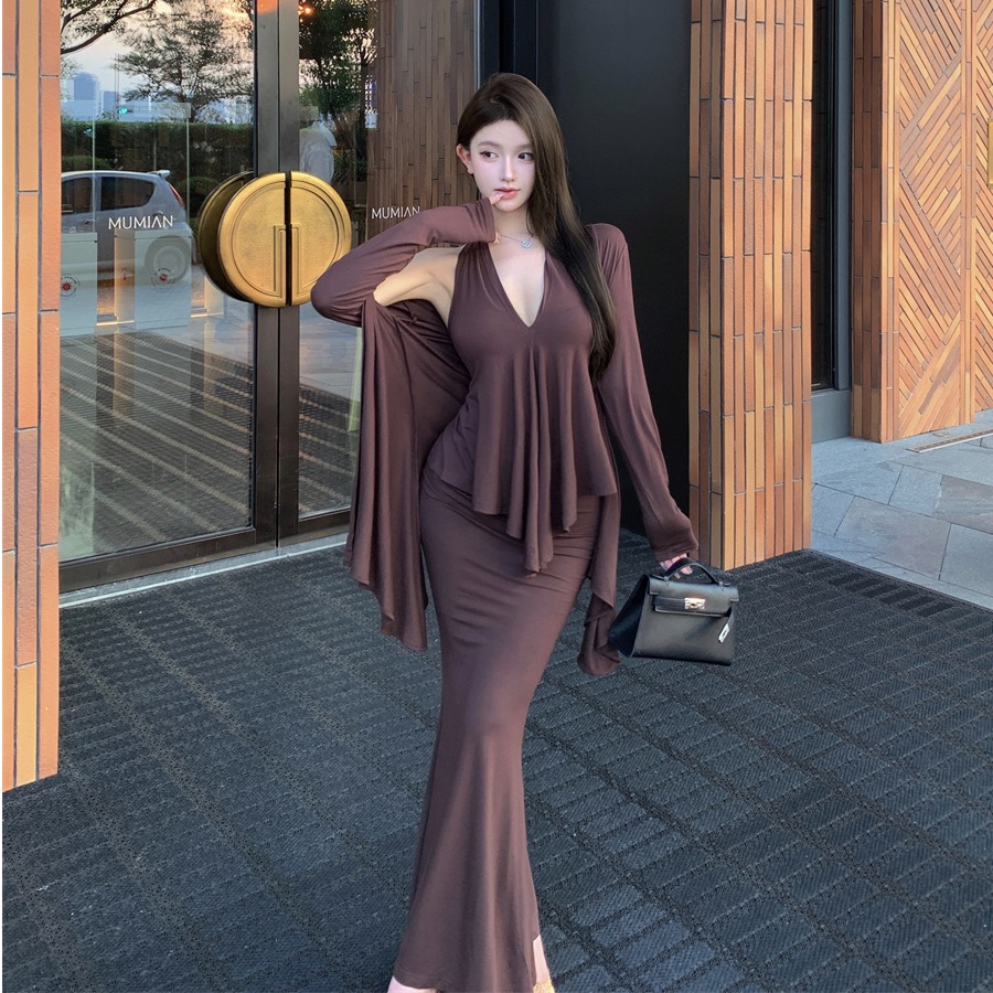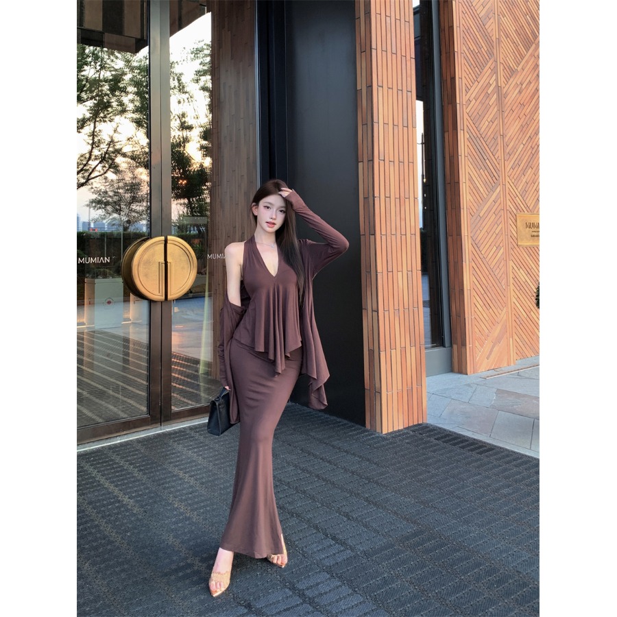 不规则长袖开衫外套上衣挂脖背心女秋季穿搭套装鱼尾半身裙三件套